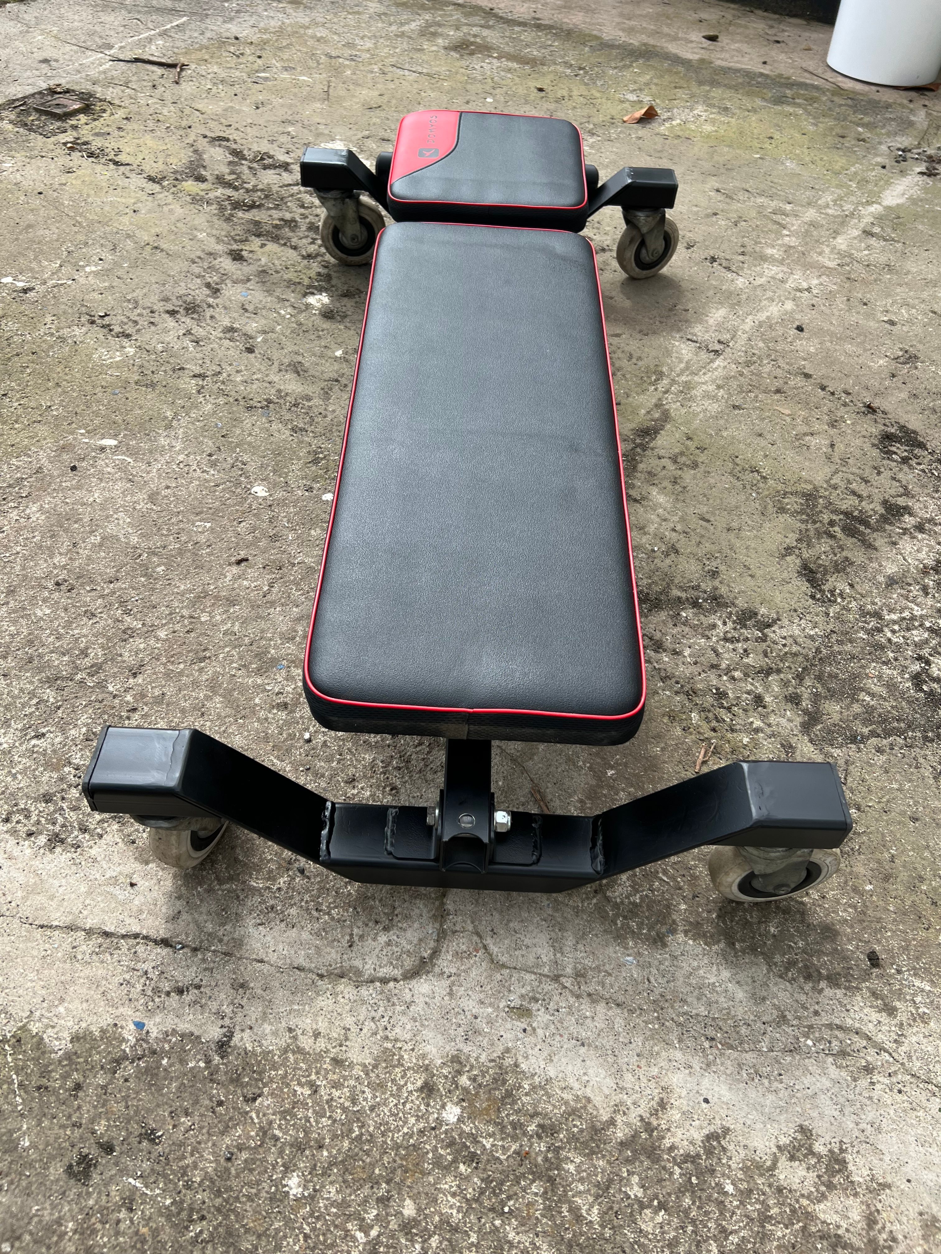 So, I bought a second hand weights bench and made the axles from some box section I had left over from another project. I welded on some brackets to bolt them to the weights bench. Some old shopping trolley wheels I had squirrelled away many years ago eventually came in handy.