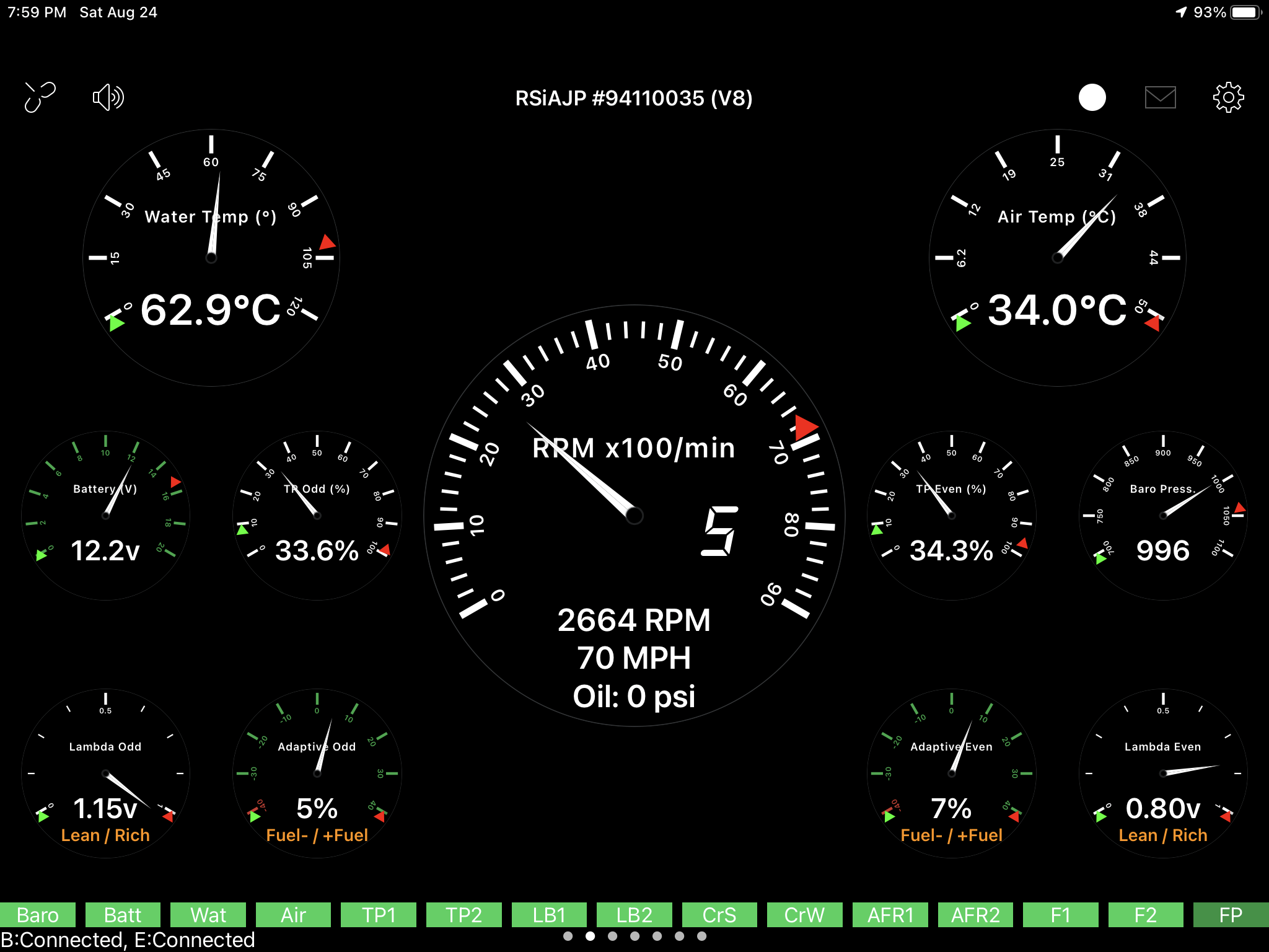 Thanks Greg, it's great that both formats can be used in my Cerbera, like you, I often find my battery has died. The Bluetooth set up is a real bonus, so you can charge your phone and still read the data fairly simply. I may well get the Bluetooth adapter and give it a go. Nice work, and I can see from your website you have great future plans. Do you think there's any way oil, pressure and temp can be added into the data mix? Never ceases to amaze me how clever Cerbera owners are.