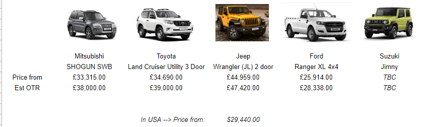 Although nearer to £25k would be more realistic budget wise for me. I just think it's a shame there is so little choice, only the Jimny and maybe a pickup (which are a bit bigger than I want really and always end up basic spec). And we don't get the "fun" pickups like the US market does, although they are a bit more pricey to be fair.