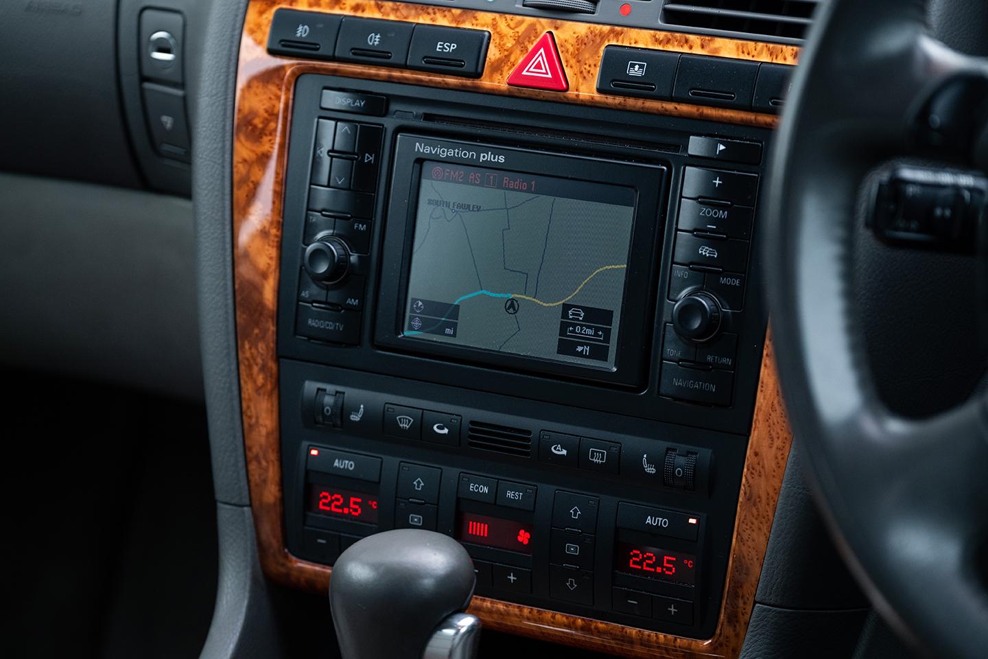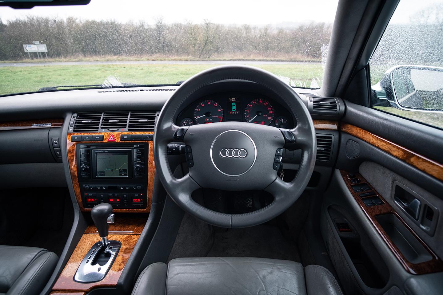 It has plenty of olfactory character too, with the distinctive odour or the very leathery leather that German manufacturers used at the time. The heritage car's wooden trim has the orangish Oompa Loompa hue that Audi seemed particularly fond of. The abundance of buttons on the centre console now seems a strange contrast with the lack of switchgear on the face of the steering wheel - this containing just basic audio repeater controls and the switches for manual gear selection. This D2 is late enough to have received a fully graphical sat nav system complete with a blocky display screen; earlier examples got a system that relayed guidance exclusively through voice instructions and junction pictograms. I'm pleased to see the clock is set to 1999, and soon confirm that the rest of the car is.