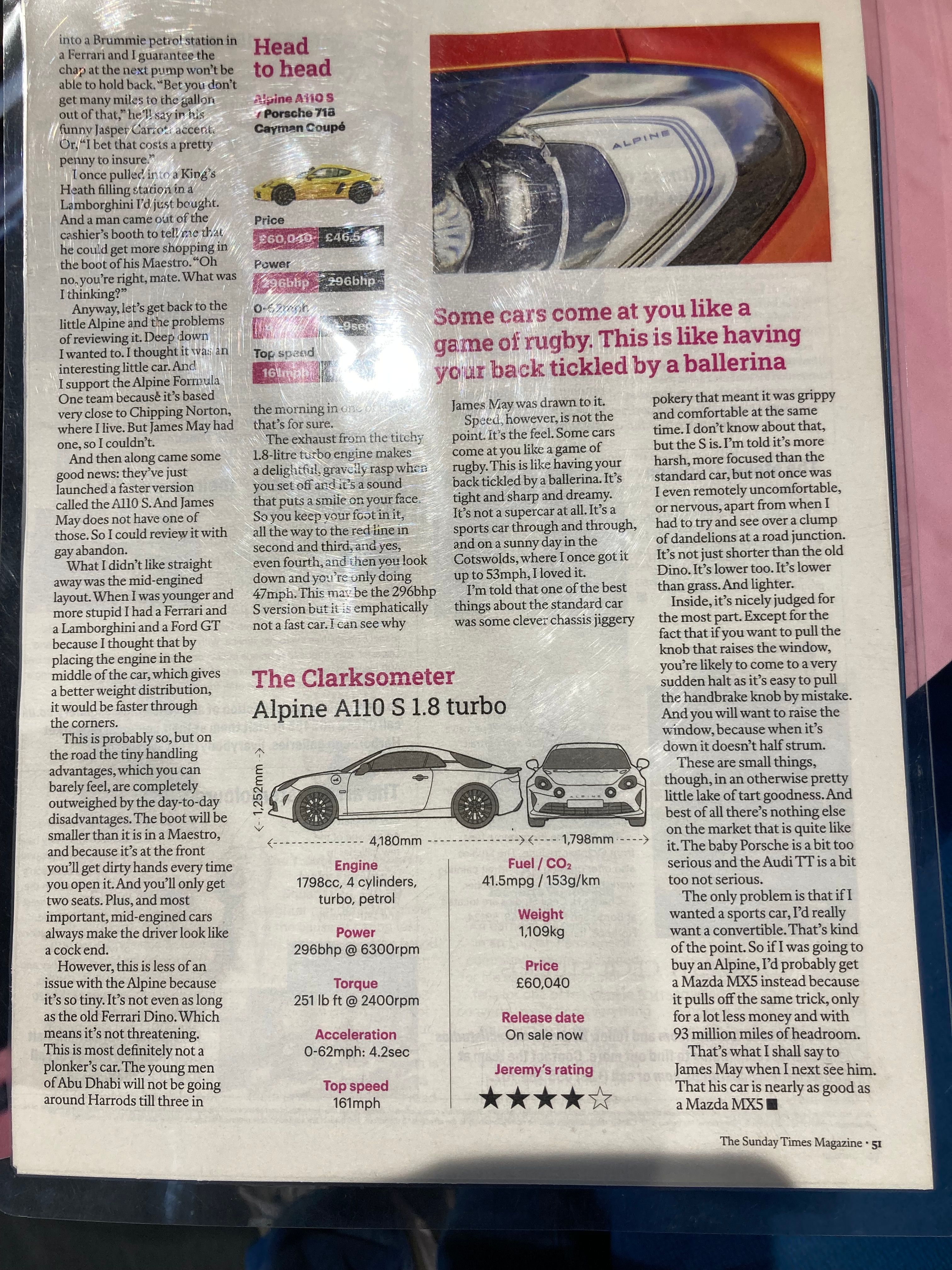 Pleased to hear it. I've always liked her.Re franchracing: if I had his resources, I'd have a team of engineers working out how to get a manual gearbox into an A110, then get rid of the EPAS. Or perhaps I'd just make do with a GMA T33 instead.