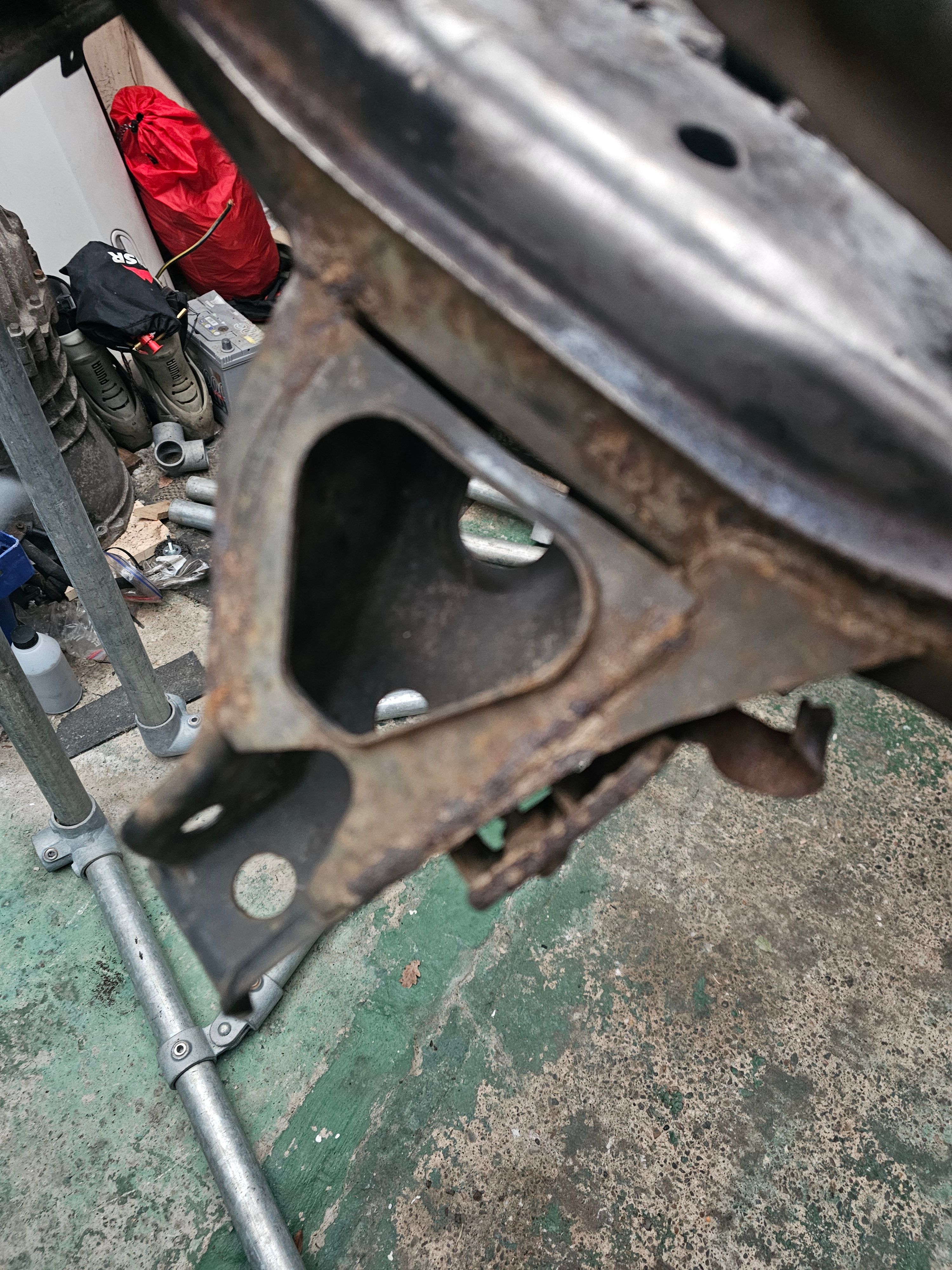 With all the bits off the car, I set about putting the shell on a turnover stand for ease of access for each stage of the project, including welding, blasting, caging and respraying. I'd thoroughly recommend getting in touch with Ade Foreman (of Ade Foreman Light Engineering) if you are in the market for a turnover stand, and the active Facebook community is a splendid resource.