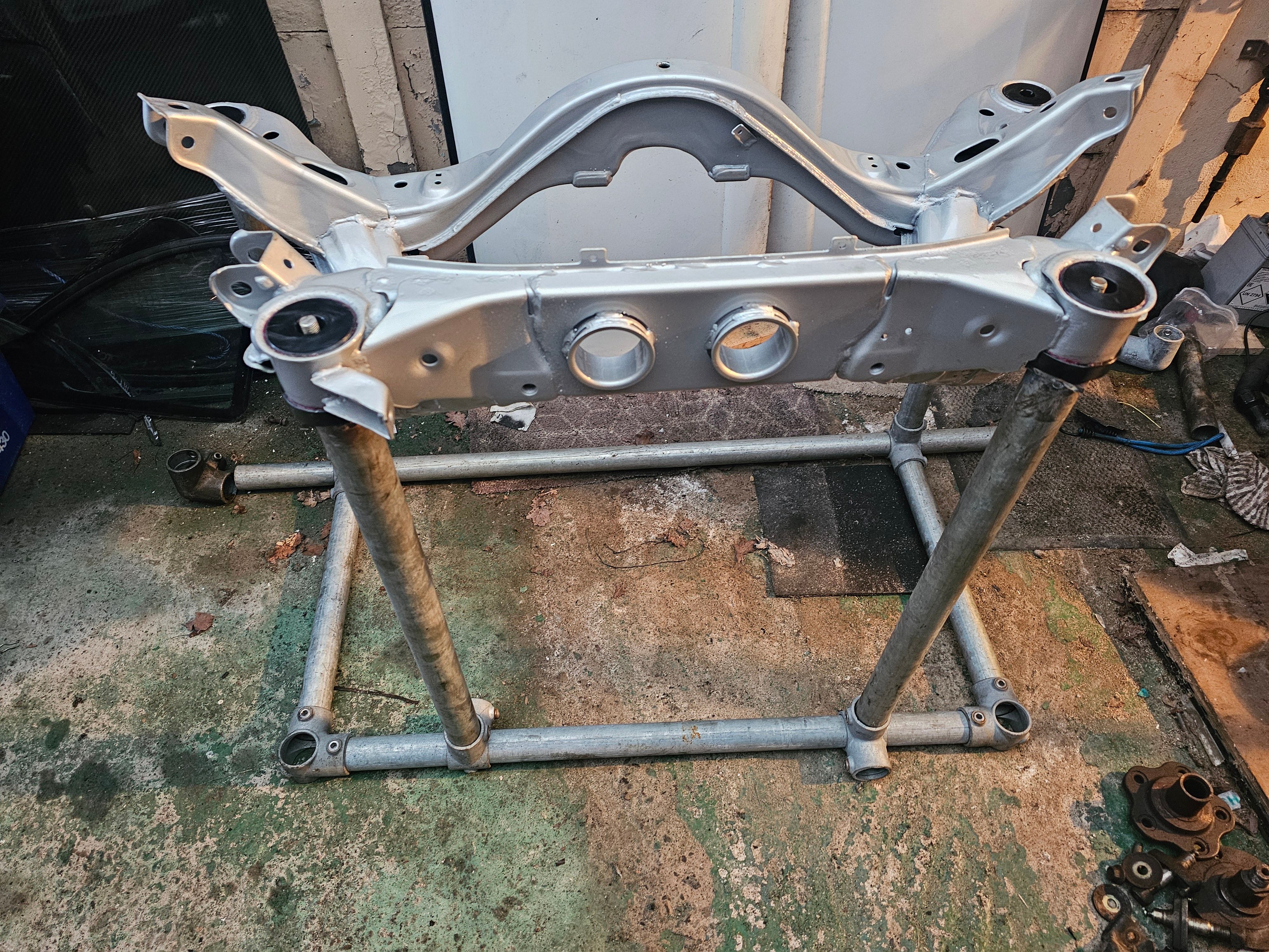 With all of the fundamental strengthening undertaken the subframe was then powdercoated, after that it was time for new solid bushes to stop it moving about under load (this did make it very hard to reinstall!).