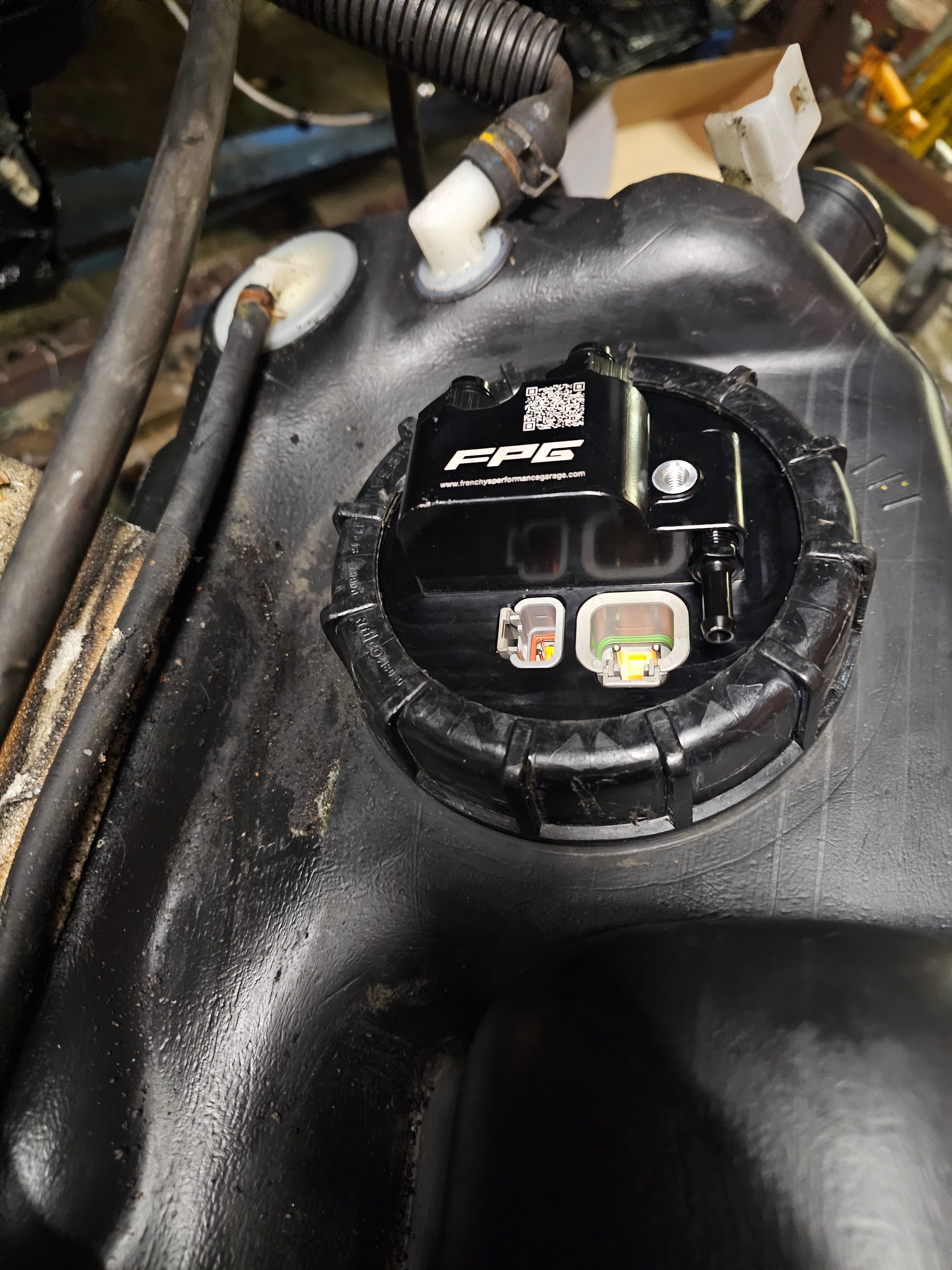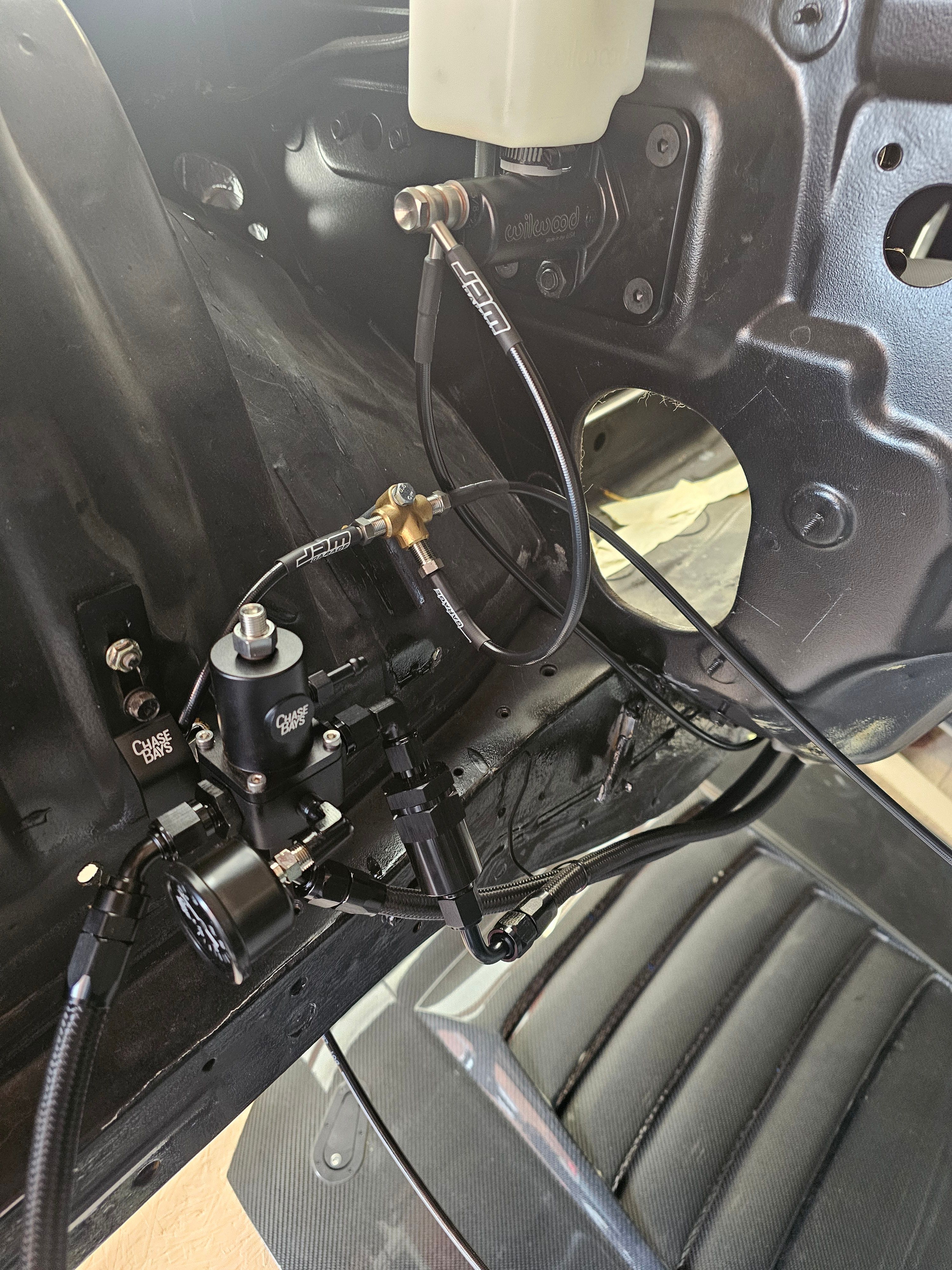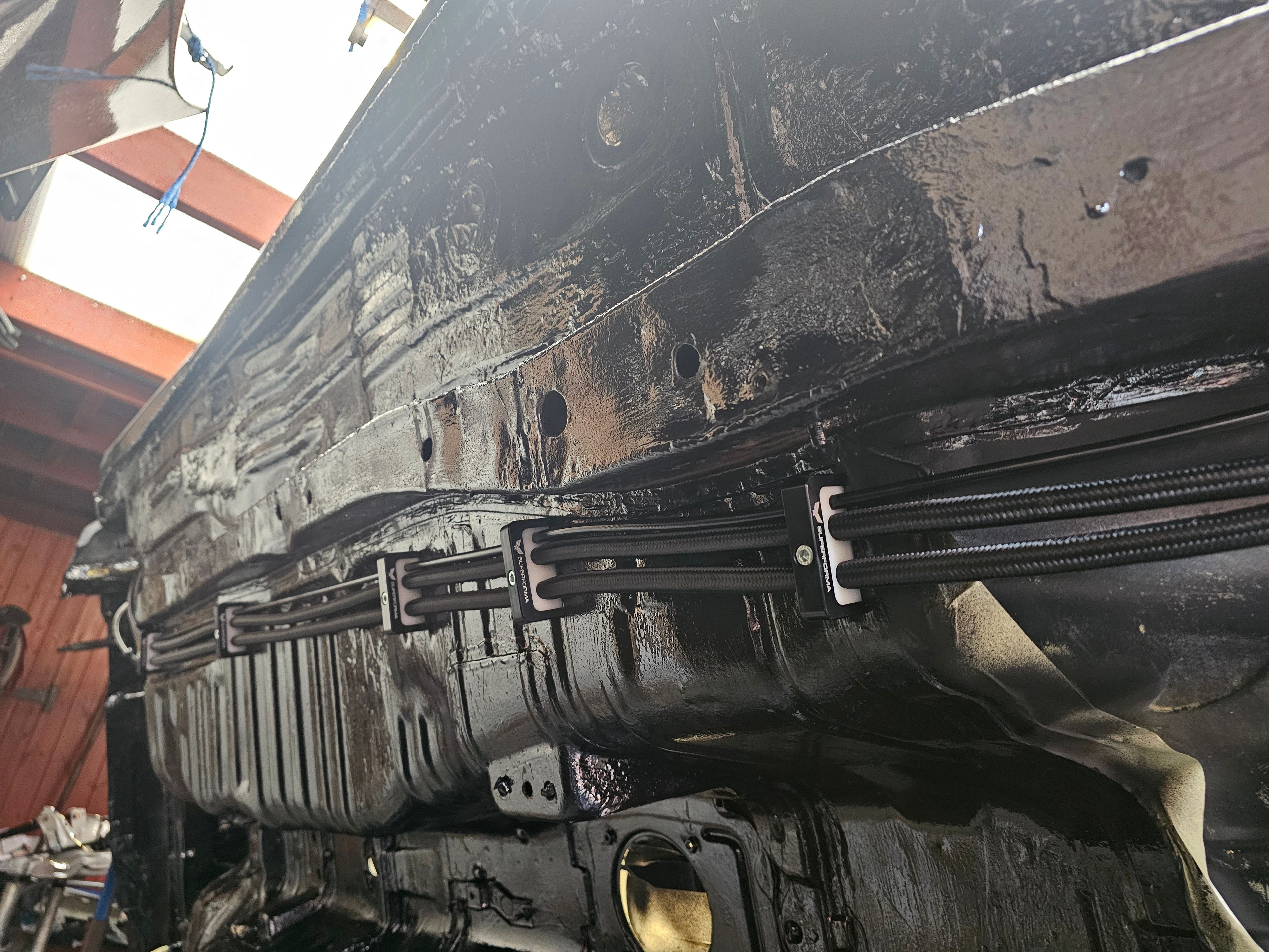 With the car (still) in the air oversized fuel lines and battery cables were installed.