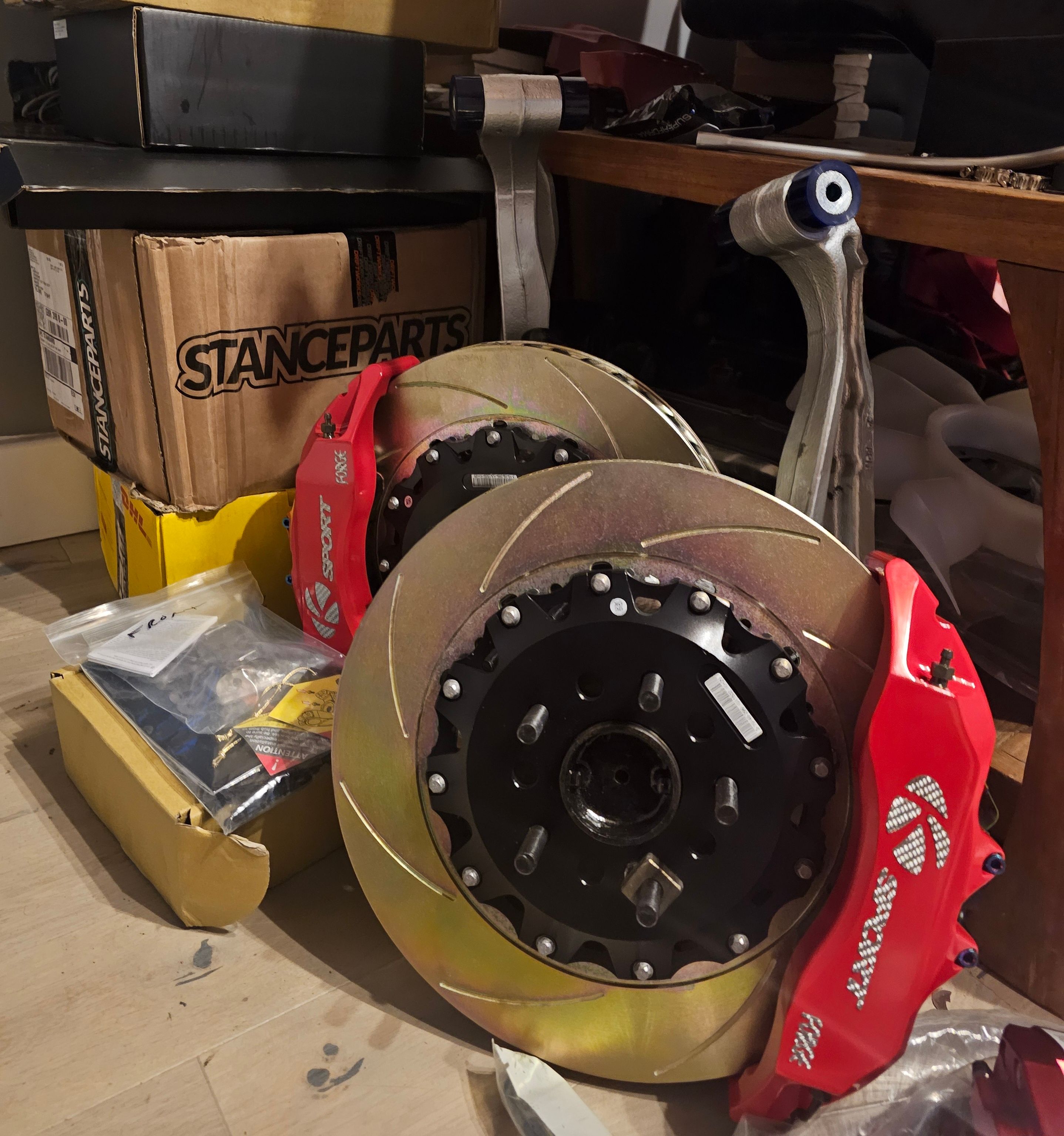 Rear brake test fit and new suspension arms sourced from Driftworks.