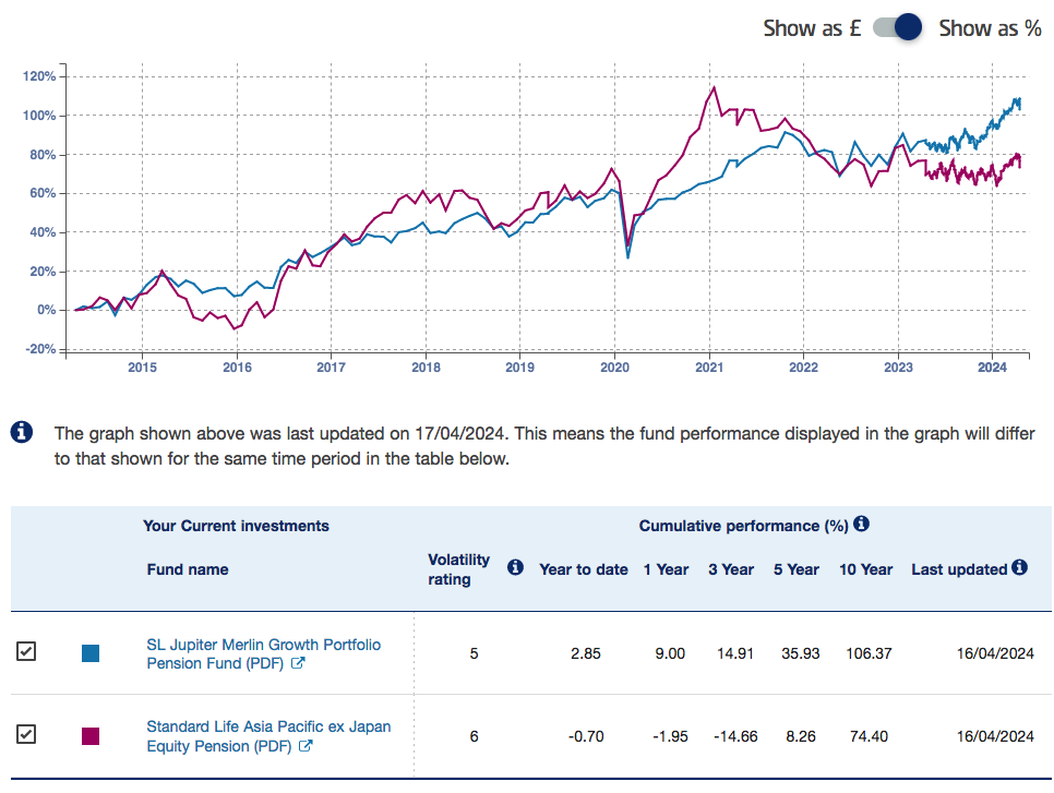 I have two main pots, and two smaller ones - In terms of the main pots - half is in a Standard Life fund that has done pretty well over time. I stopped paying in in 2016 and it has doubled since then. Every time I look to change the fund, I convince myself that it's fine where it is (those returns and the costs look ok to me)