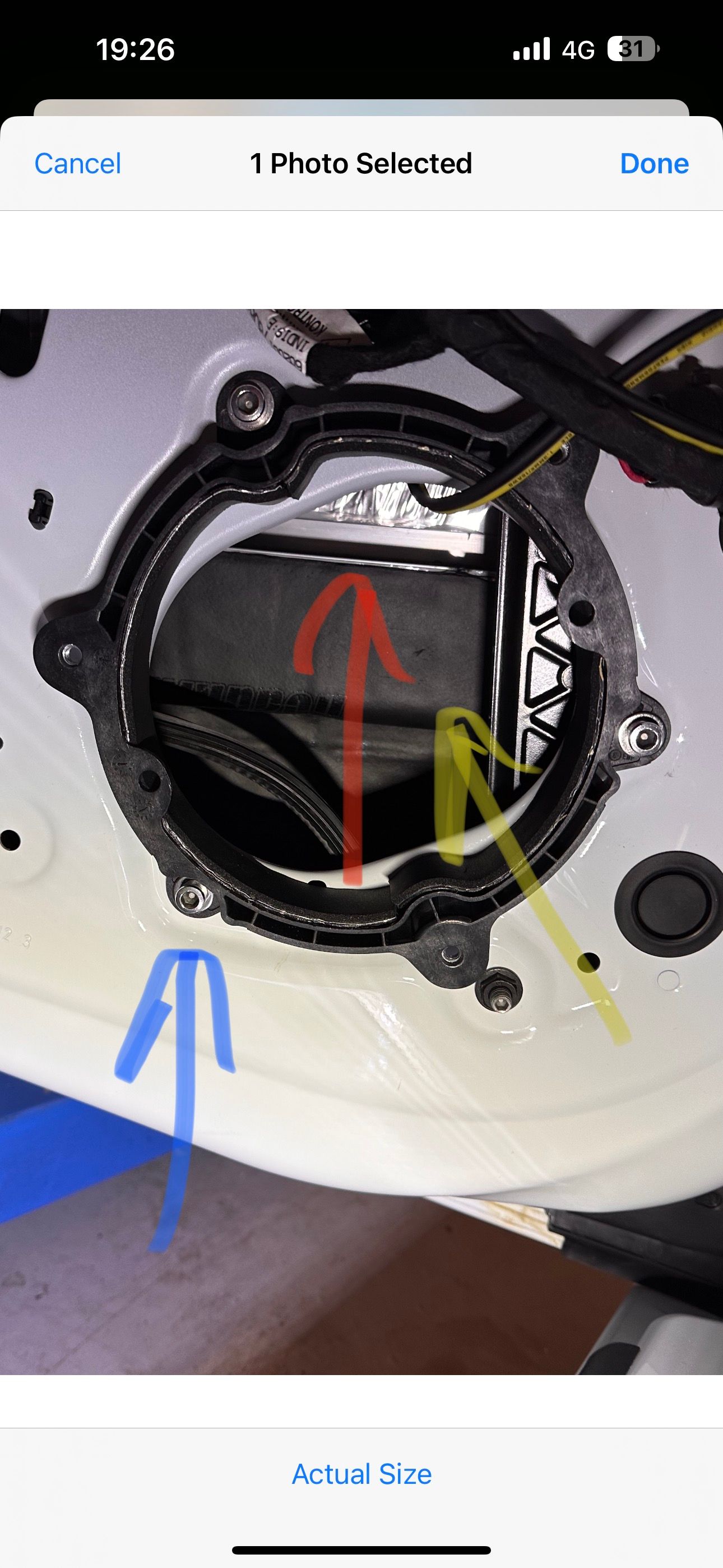 And finally drill out the 3 rivets holding the second plastic ring to the door, and epoxy the plastic ring to the door, securing with nylocs and some decent bolts. That’s an important step as that back ring leaks bass like a sieve. (Blue arrow)