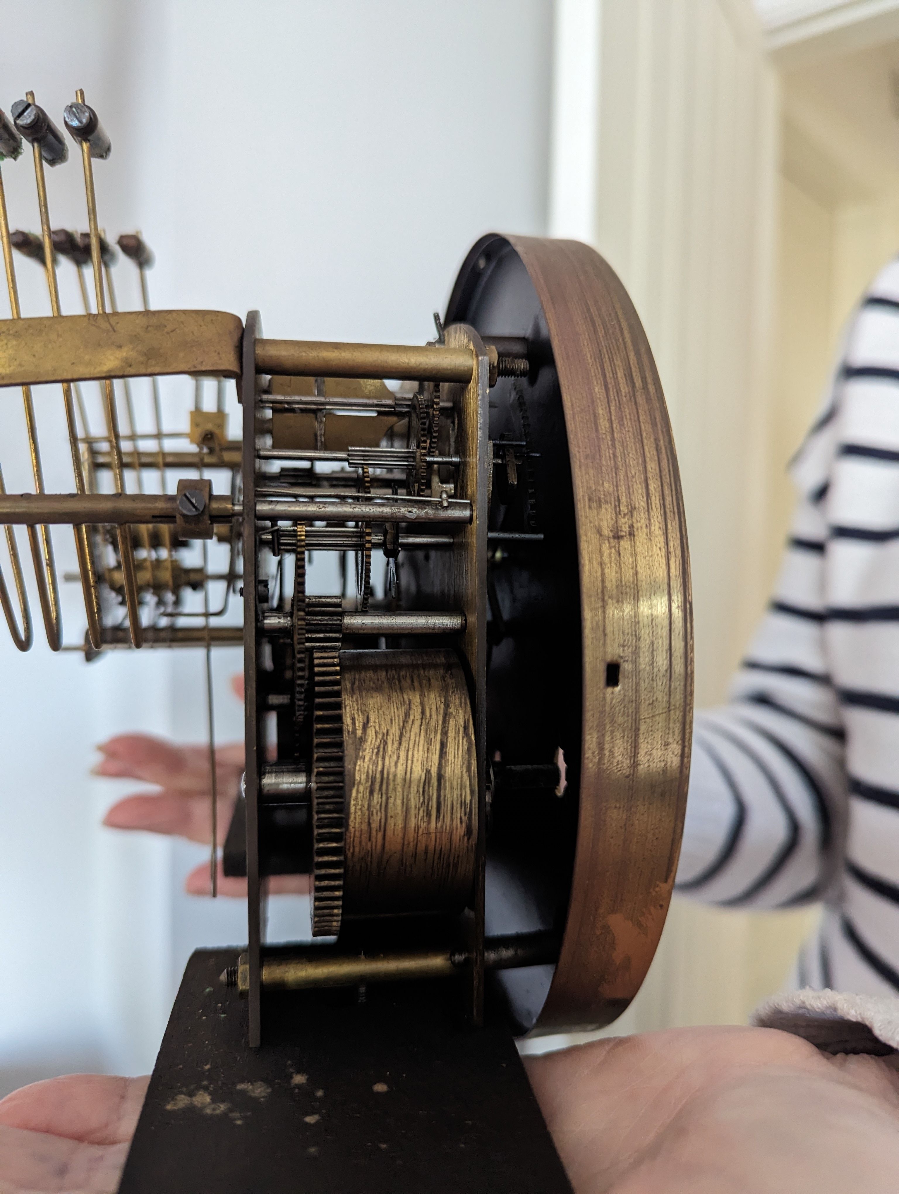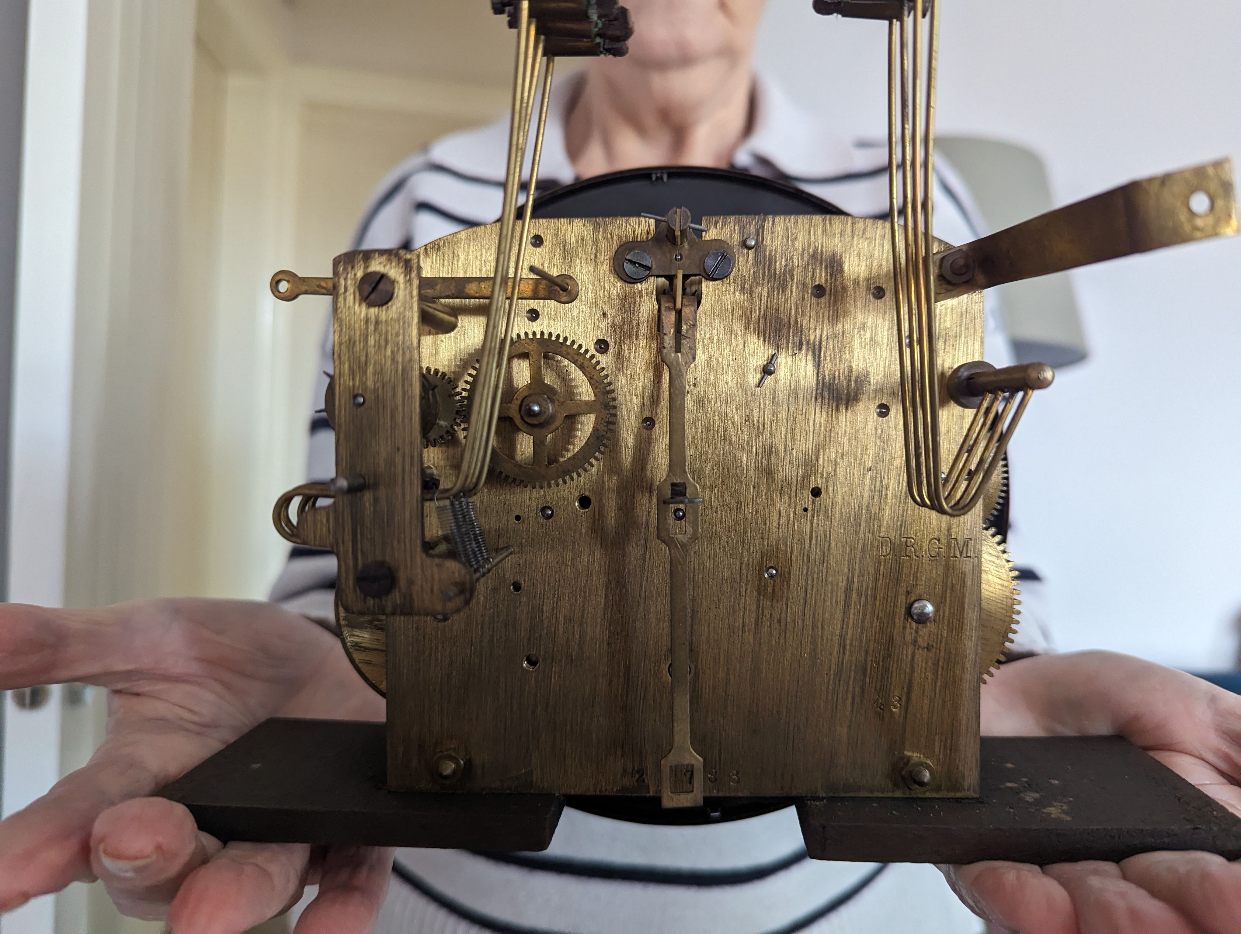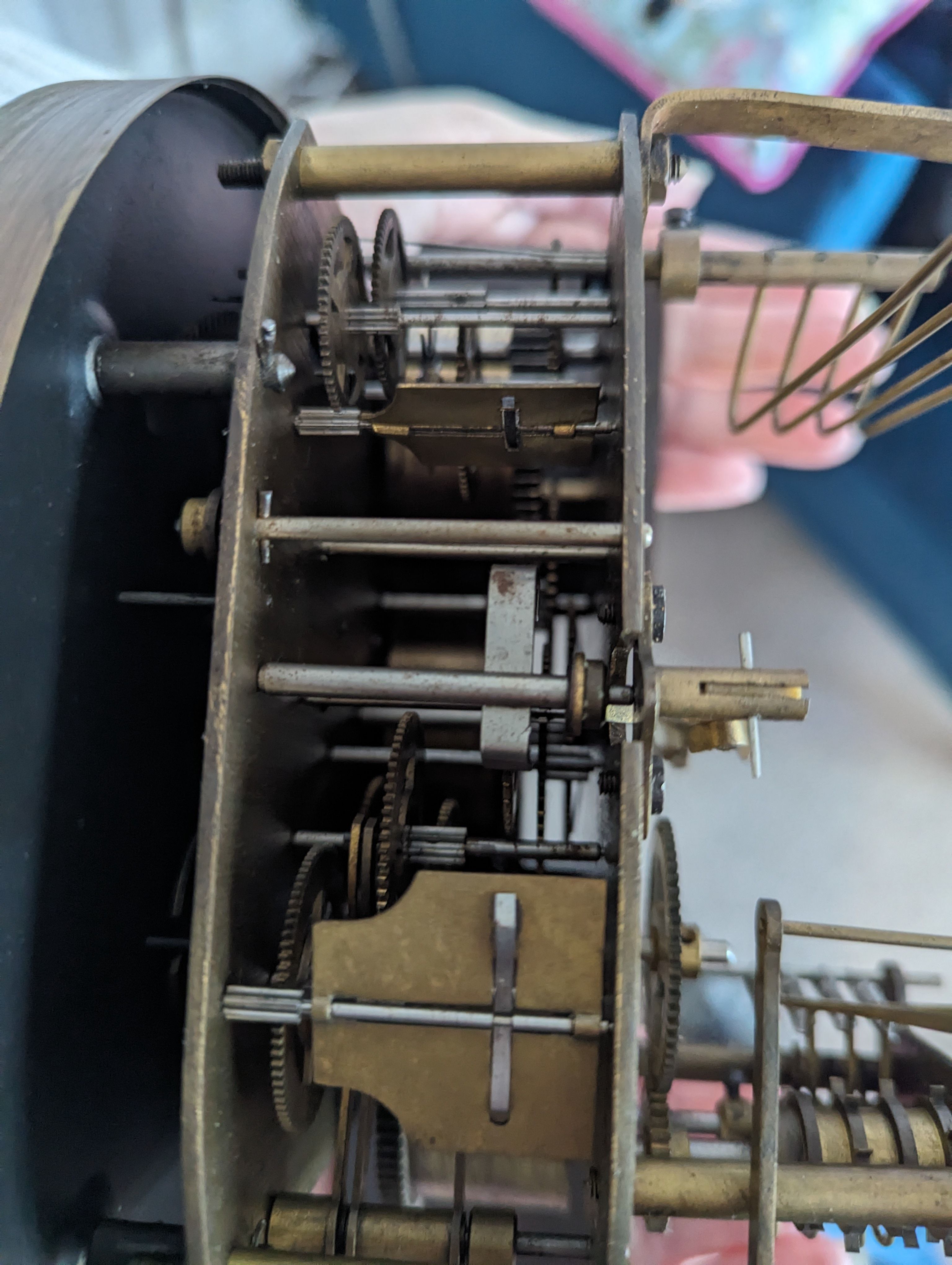 She's found my grandparents old wall clock, possibly about 1930 or so. The clock has been in storage in the loft for at least 30 years. I've tried to wind it and the centre winder appears to be fully wound. The other two (I'm assuming for the chimes are free).