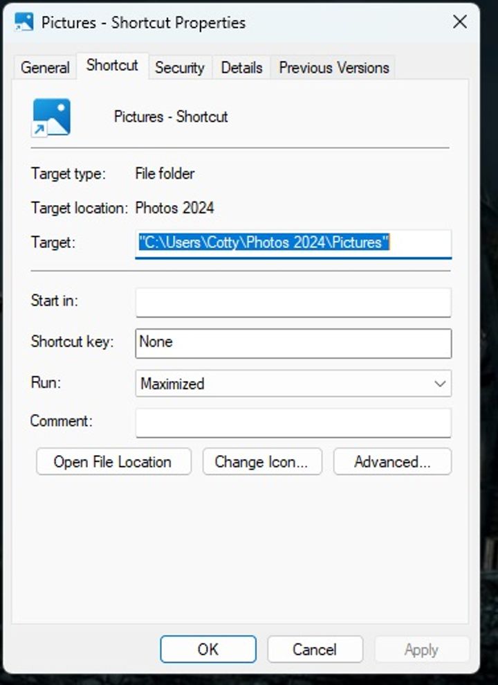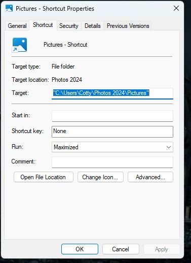 I never had a shortcut before today. I could not access the properties on the app with an option to select "run - maximised" so I created the shortcut.