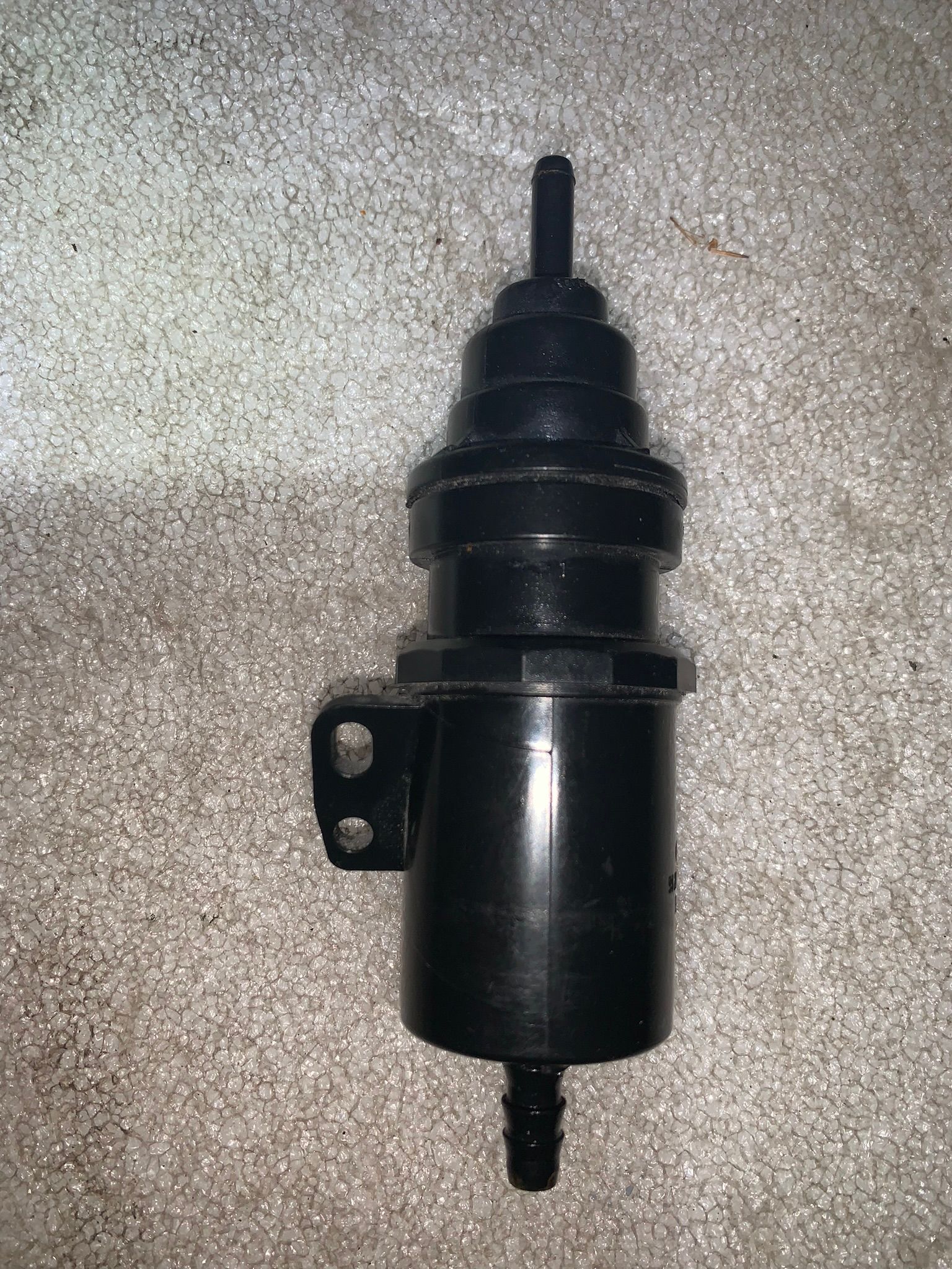 Next step was to locate the roll over valve which is tie wrapped to the passenger side B pillar. I removed that and found it was blocked. Rust came out of it when I tapped it against a hard surface. I tested the lines to the fuel tank and to the carbon canister with some low pressure air (bike pump) and both were clear. I then replaced the roll over valve with a Mocal TRL7 making sure the arrow pointed upwards as per the instructions. This now meant that the line was clear right through from the fuel tank to the carbon canister middle input connection.