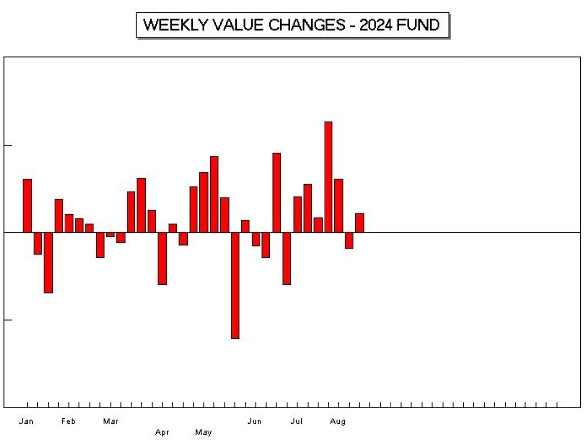 For example, this chart shows my weekly losses and gains so far this year. How would a new investor sleep on Friday night, after losing money (on paper) that week? It happens continually. To always use money that is not needed is vital, because you will never become a forced seller.