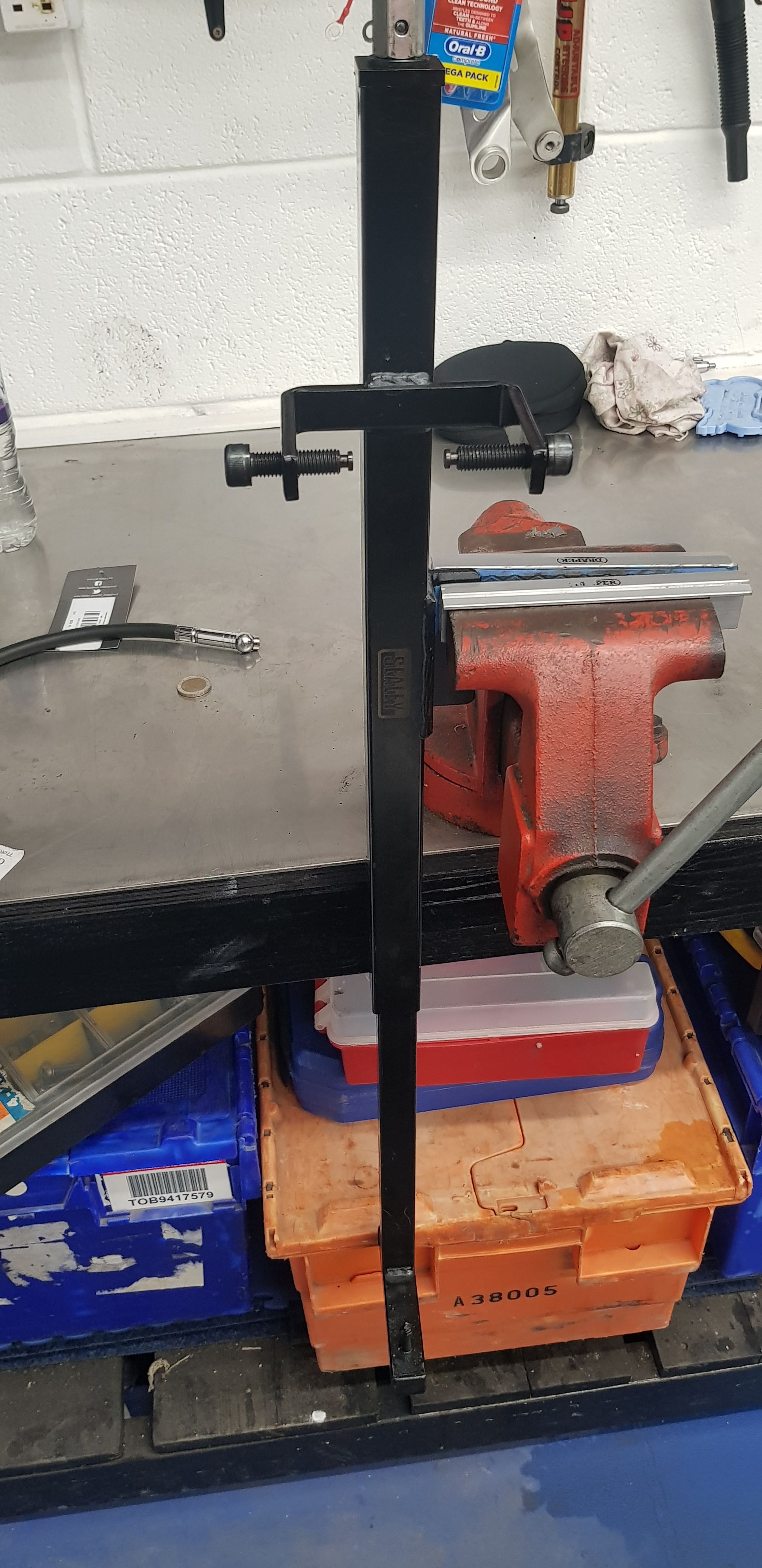 In the previous pic of the forks - we used a jubilee clip around the white tube, holding a ratchet strap and then ratcheted it down