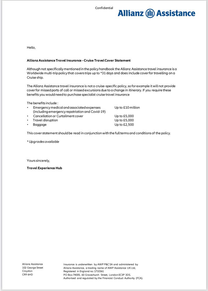 Mrs BC and I have had an annual policy with Allianz in place for some years. We cruise 3-4 times a year and never had an issue. We just booked a cruise with Cunard rather than our usual Seabourn. The travel agent went out of her way to say that we need ‘Cruise Specific Travel Insurance’. I checked with Allianz who sent me their cruise cover details as below. I also checked the Cunard website and it seems to me that our cover is more than adequate.