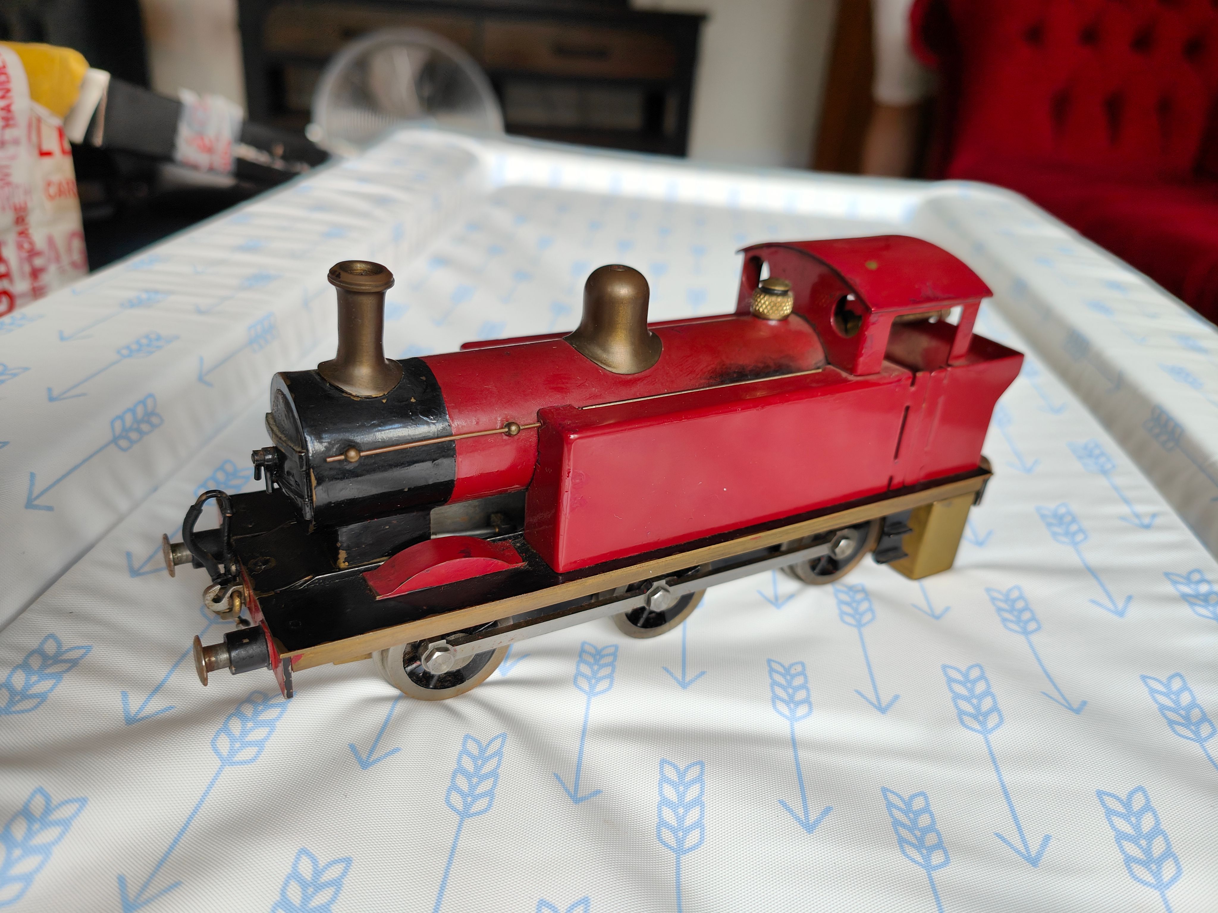 I was wondering (from the sliughtly chunky appearance) if it was a brass-kit; the knurled brass on the valve also drew my eye as it seems unusual.It looks like a spirit fired O Gauge "Jinty" and a quick google suggests if it wasn't hand built then maybe Burtons or Leech were the manufacturer. It might be worth a tank of V- Power at auction.