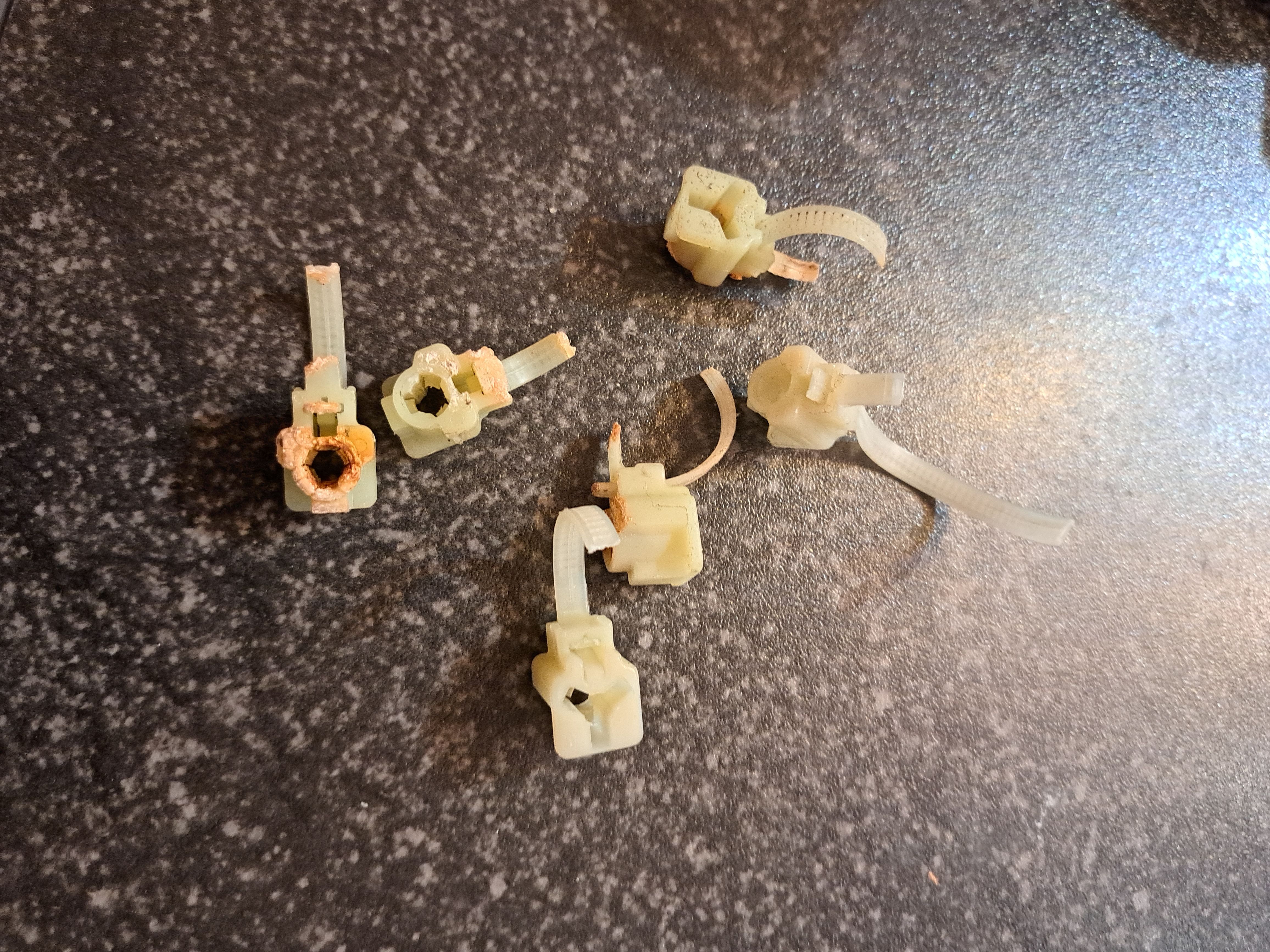 Are you sure you can't just pull the end of the tie-wrap part through the slot in the main body with long-nose pliers (or the like), trim off the cut stub and just thread a conventional cable tie back through the now-empty slot? Then you can reuse the main moulding that goes onto the weld stud. Just an idea from looking as the pictures.