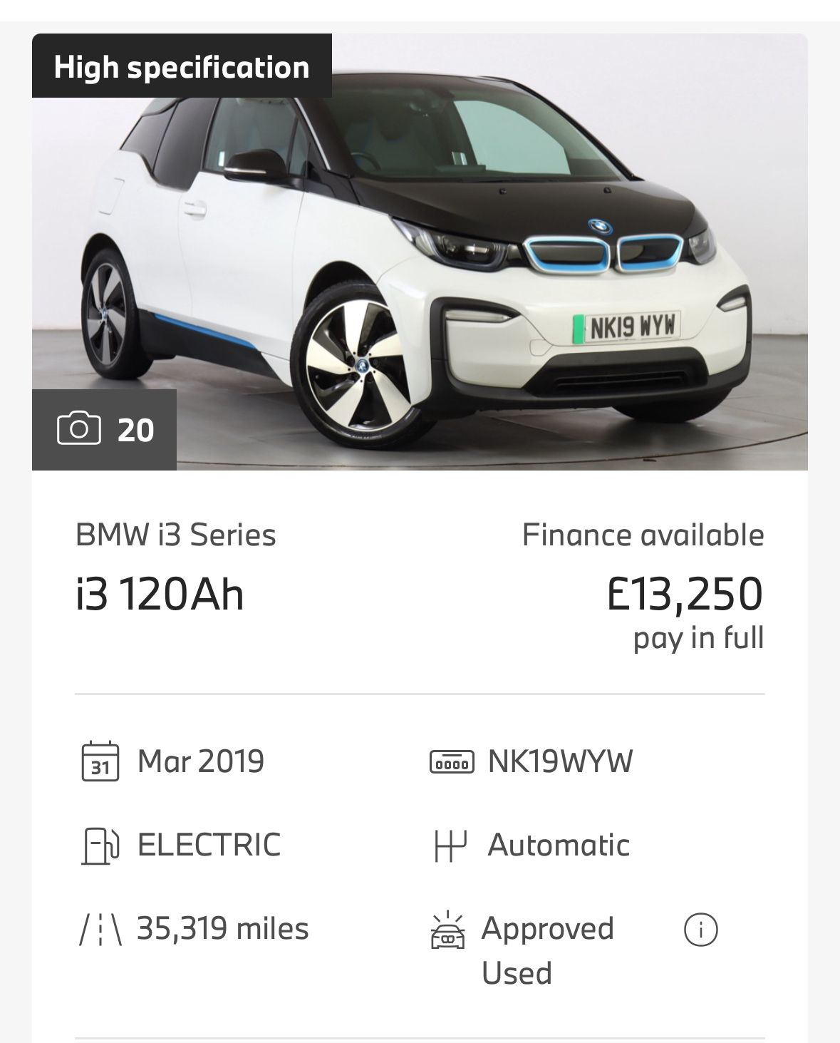 id started looking at 2019 I3s with the 42kwh battery without rex just as it has the biggest battery and if we had to take it on a longer journey we wouldn't need to stop quite as often (I am aware it not a fast charging car by today's standard but how long would it take really to do that 20-80% charge?)