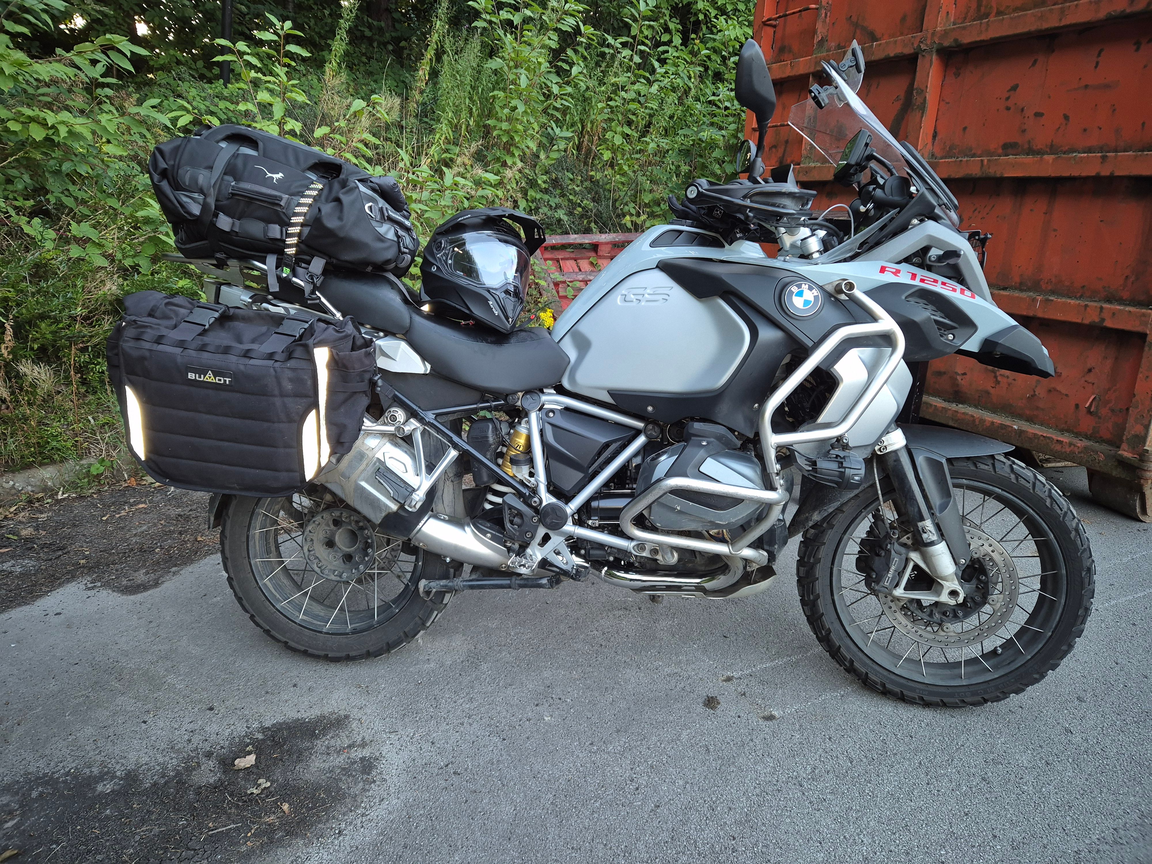 + 30l Mosko Moto duffel (seems to take alot more than 30l worth of stuff & extra bits can be stashed in the 'beaver tail' bit - easy enough to take off the bike and use as a carry bag when you get to the ferry / campsite / hotel whatever. It has hidden rucksack straps so you can turn it into a rucksack in a couple of seconds if you want to have you hands free to carry your other bit and pieces away from the bike.