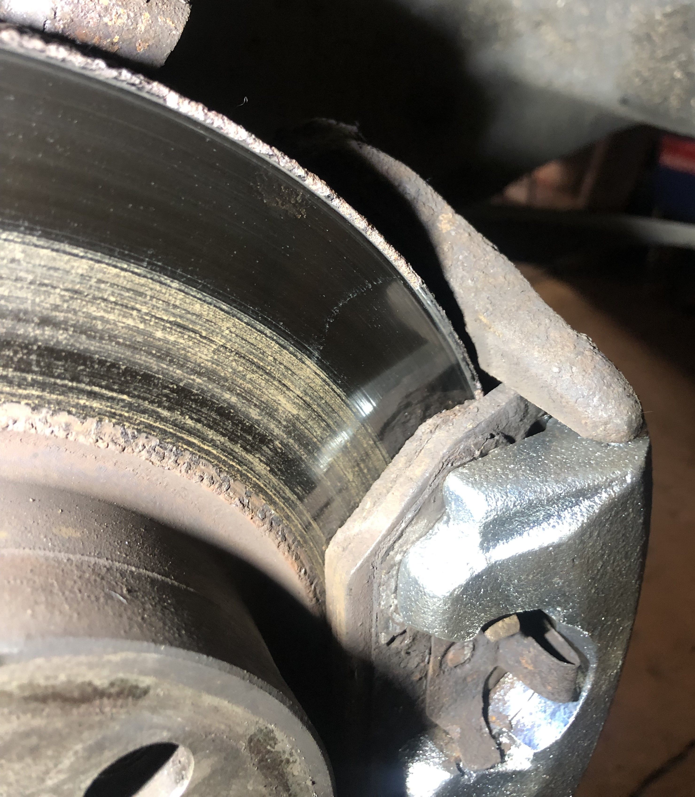 OMG, then they have been like that for years, as fitted by the garage! The other pad, in the piston, is nice shiny metal prongs, having been protected from the elements in there.It's pissing down now so I will leave as-is (until this plays on my mind to the point where I have to go out and sort it).