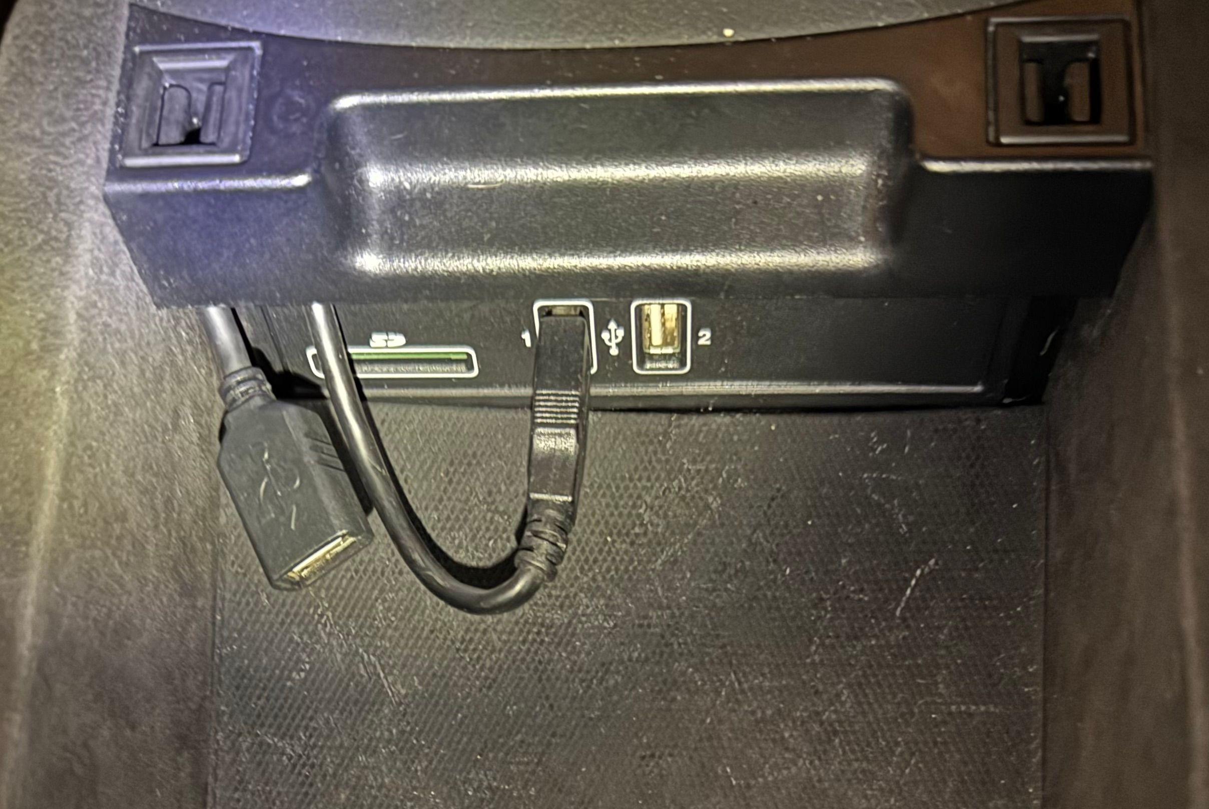 Thirdly, here’s the arrangement of USB sockets under my armrest. The audio out of the IDCore goes into USB 1 via the lead you can see plugged into USB1. USB 2 isn’t used by IDCore and is empty (as is the SD card slot). The USB socket on a short lead (far left) is USB input for the IDCore and allows wired connection of phone (use a Genuine APPLE LEAD for iPhone) or if in case you want to ‘mirror’ the phone (e.g. for watching YouTube when you’re stationary & parked up). I believe this is also the USB socket for updating firmware (using a USB stick containing the correct .BIN file).