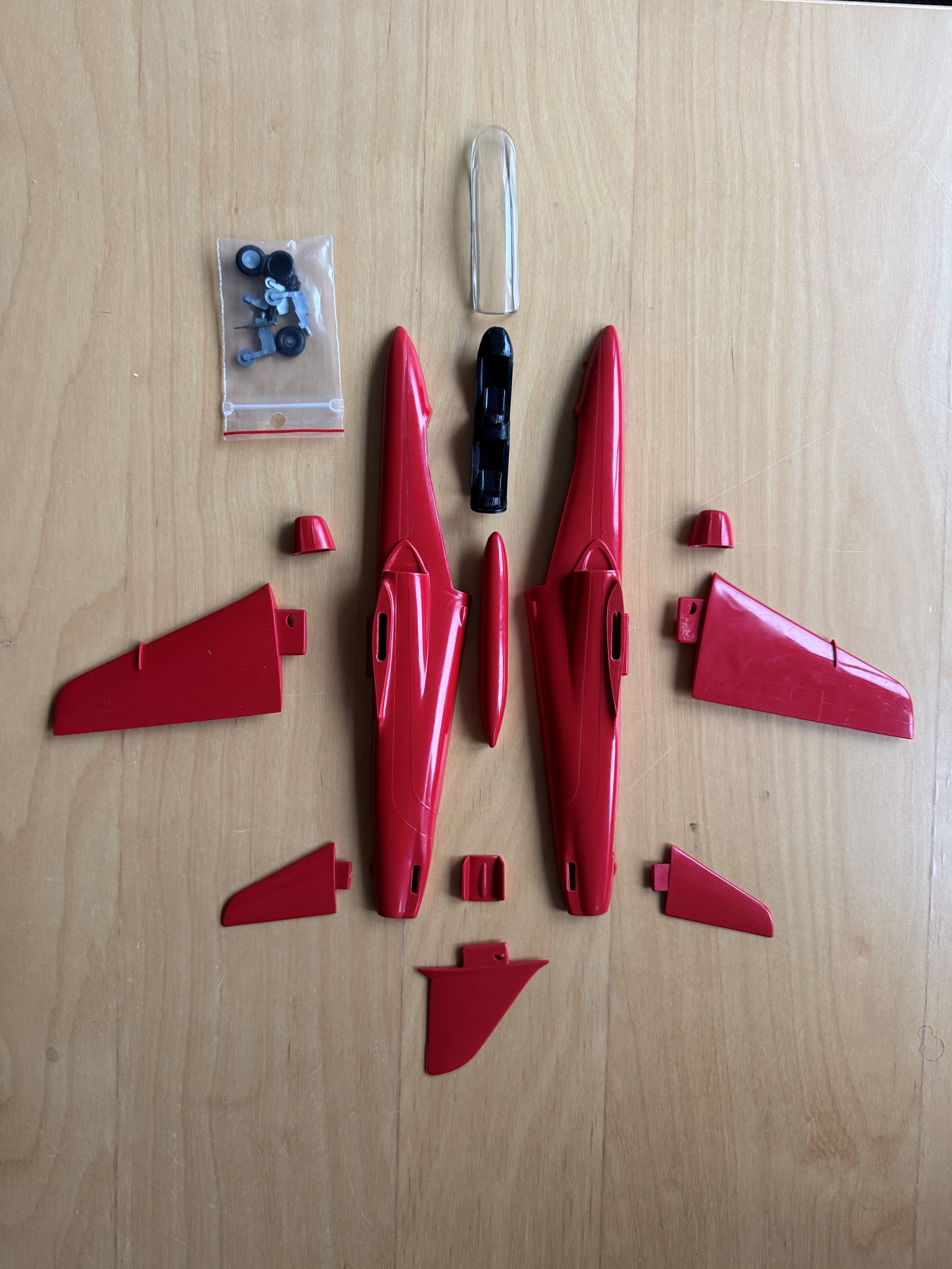 I bought this boxless old kit at the IPMS Holland annual show last week. It is a 1:48 Red Arrows Hawk, according the seller the kit used to be handed out by the team pilots to designated air show visitors after shows.