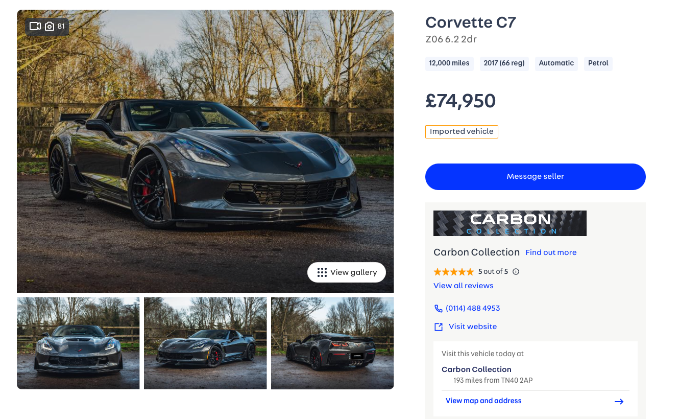 Good C7's are thin on the ground and Z06's are super rare over here and demand big money(as they do in the US). You want very detailed provenance on any imported Corvette. Strong C7 values in the US combined with costs for shipping/import duty/VAT/IVA makes for thin dealer margins on mint cars landing in the UK, so anything that looks a bargain may have a dubious past (flood damage being a common one).