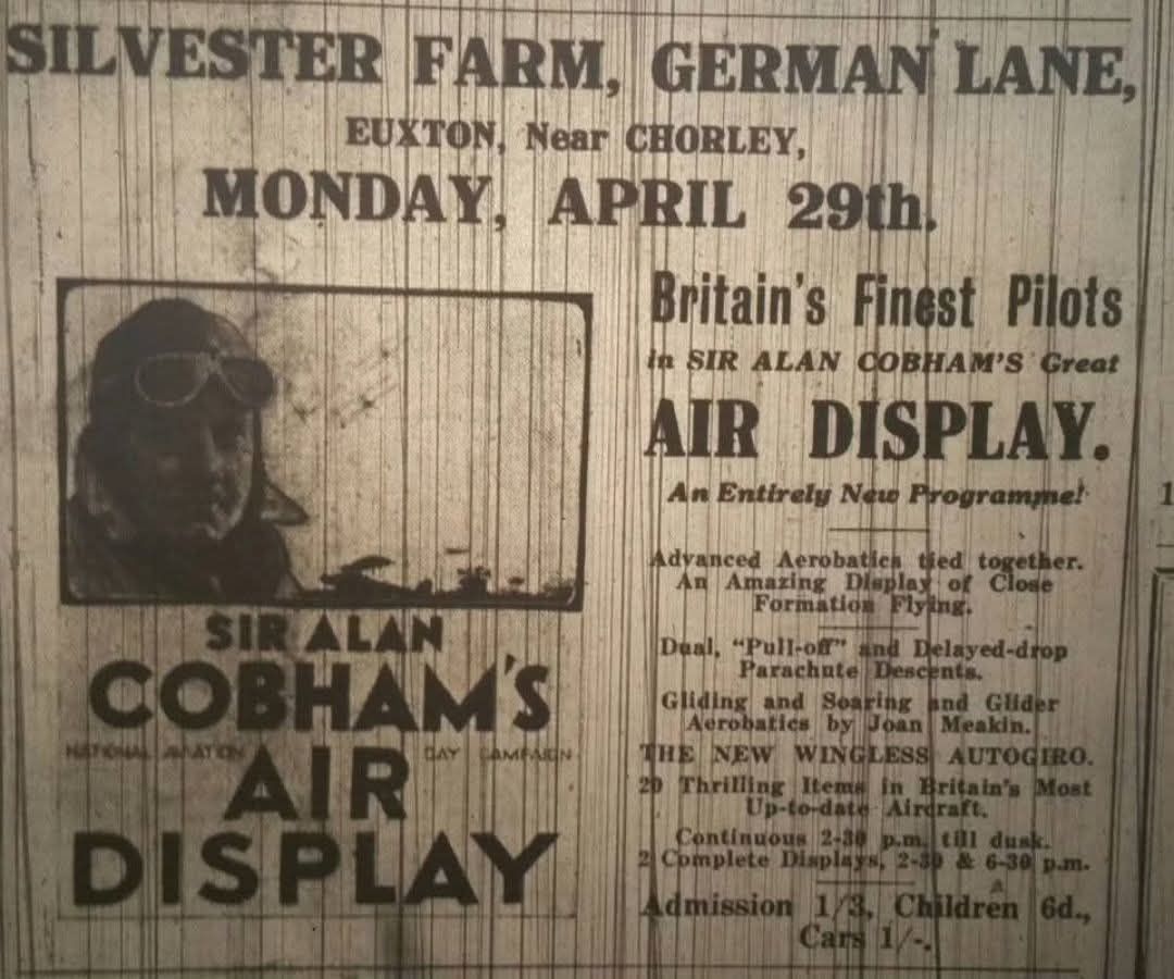 Tenuous claim to airfield-hood, Cobham visited once. hehe There's no change in the shape of fields in the vicinity before and after 1935, the largest by some margin is where the football pitch is now, bounded to the north by euxton brook. Even that is only ~500 yards from the southwest to northeast, so wouldn't be much fun for anything larger than a single engine aircraft.