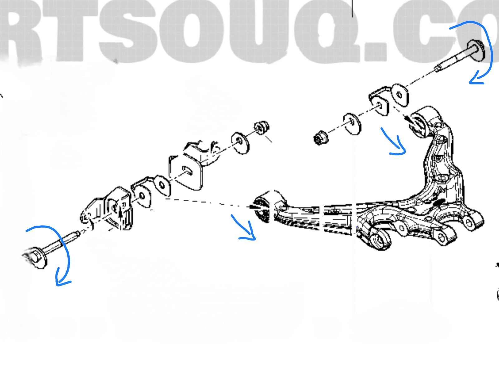 But the front axle only has one excentric bolt. Looking at the drawing below, I would assume that turning the excentric bolt rotates the lower wishbone forward or backward, so adjusting the wheel base rather than the camber. That would also lead to tension at the damper mountings, as the damper gets twisted. Do I get something wrong here?