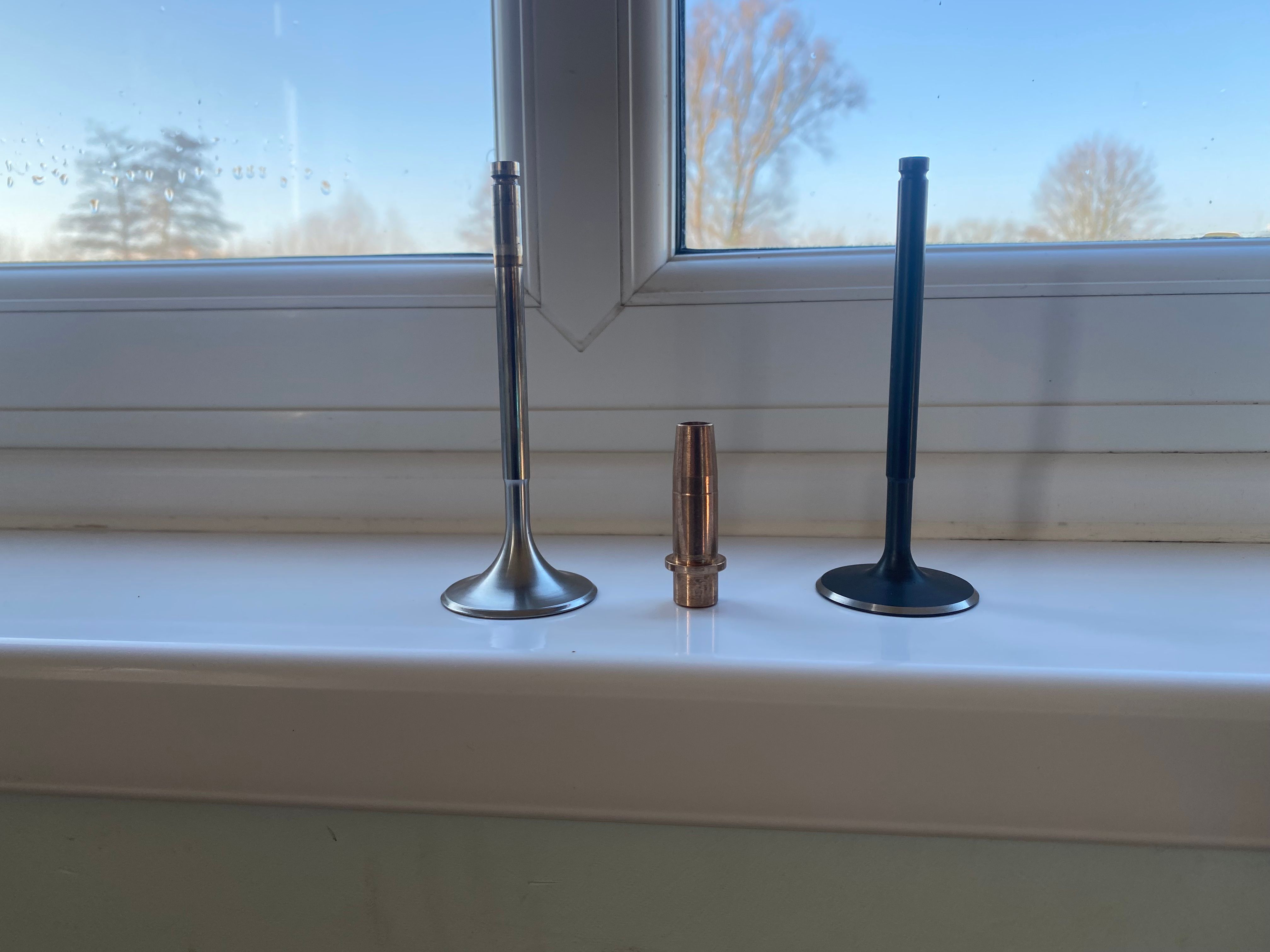 Does anyone happen to know if the AJP8 valve guides are 8mm, 5/16" or something else in terms of bore size? The unworn part of the valve stem measures 7.92mm and a 5/16" guide is 7.94mm. I've got a new colsibro guide from a Norton 850 which is 5/16" which seems to give a good fit, but the engine is largely metric hence my question. the picture shows from left to right, original inlet valve, Norton guide and new inlet valve.