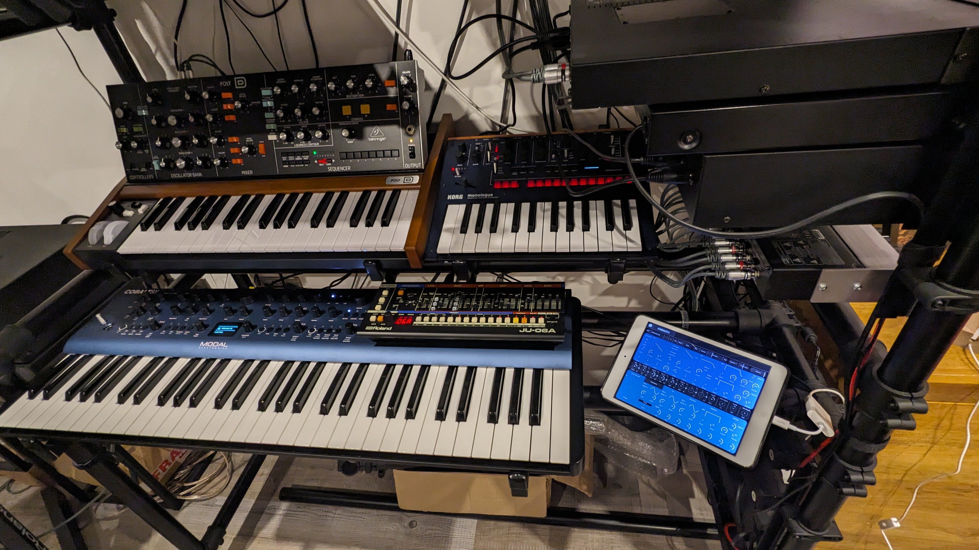 The main stack - Modal Cobalt 8X, Behringer Poly D, Korg Monologue, Roland JU-06A (modern version of the Juno)