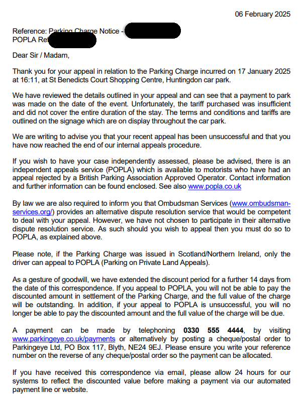 I lodged an appeal for her on the grounds their system was at fault, and also provided a screenshot of her bank statement showing the parking transaction.