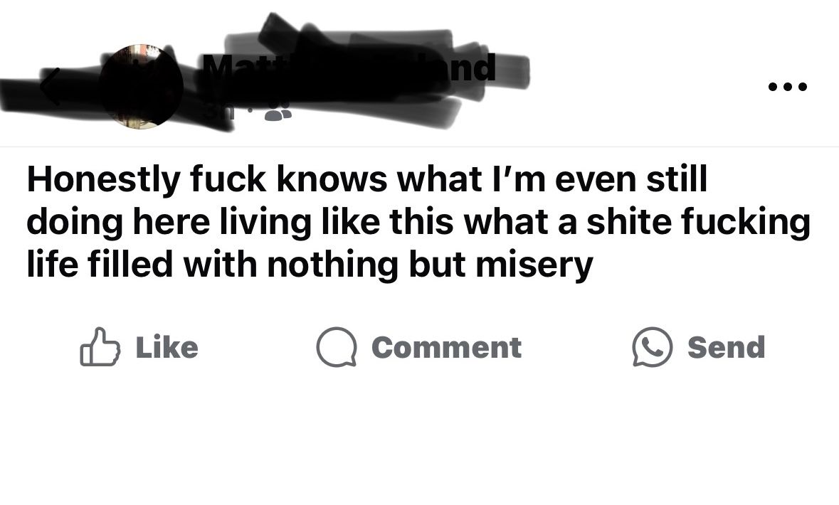 It’s 100% what it seems it is. He has been depressed for most of his life although his post this morning seems to be a step up in seriousness hence us stepping in.He has family but it’s a long and complex story and they don’t want to be involved with him at all.