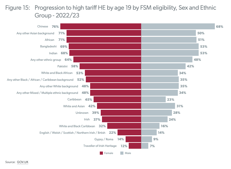 What stands out is the education levels for working class white British men. Just 14% that are eligible for free school meals (their measure of poverty) go onto HE compared to 68% of Chinese in a similar situation.