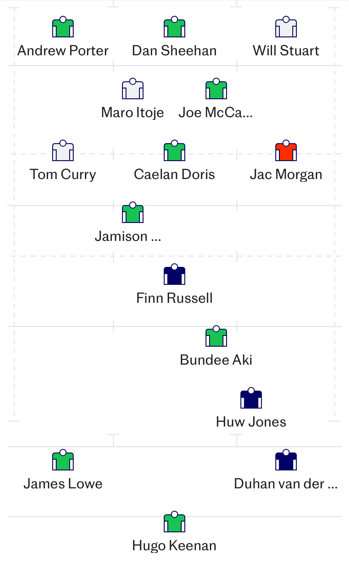 Speaking as a Scotland follower, I'm with you on Duhan and Finn. I'd still pick Duhan mind you, but I'd be leaving Russell at home. Would like to see Tuipulotu in the side - hopefully he's match fit soon.I’m not wholly sold on DvdM. He has an uncanny ability to walk through English defences. But he can go walkabout for long periods of a game. Also not won over by Russell at 10. He is too unpredictable for his own good. and when he makes a mistake they rarely seem to be small.