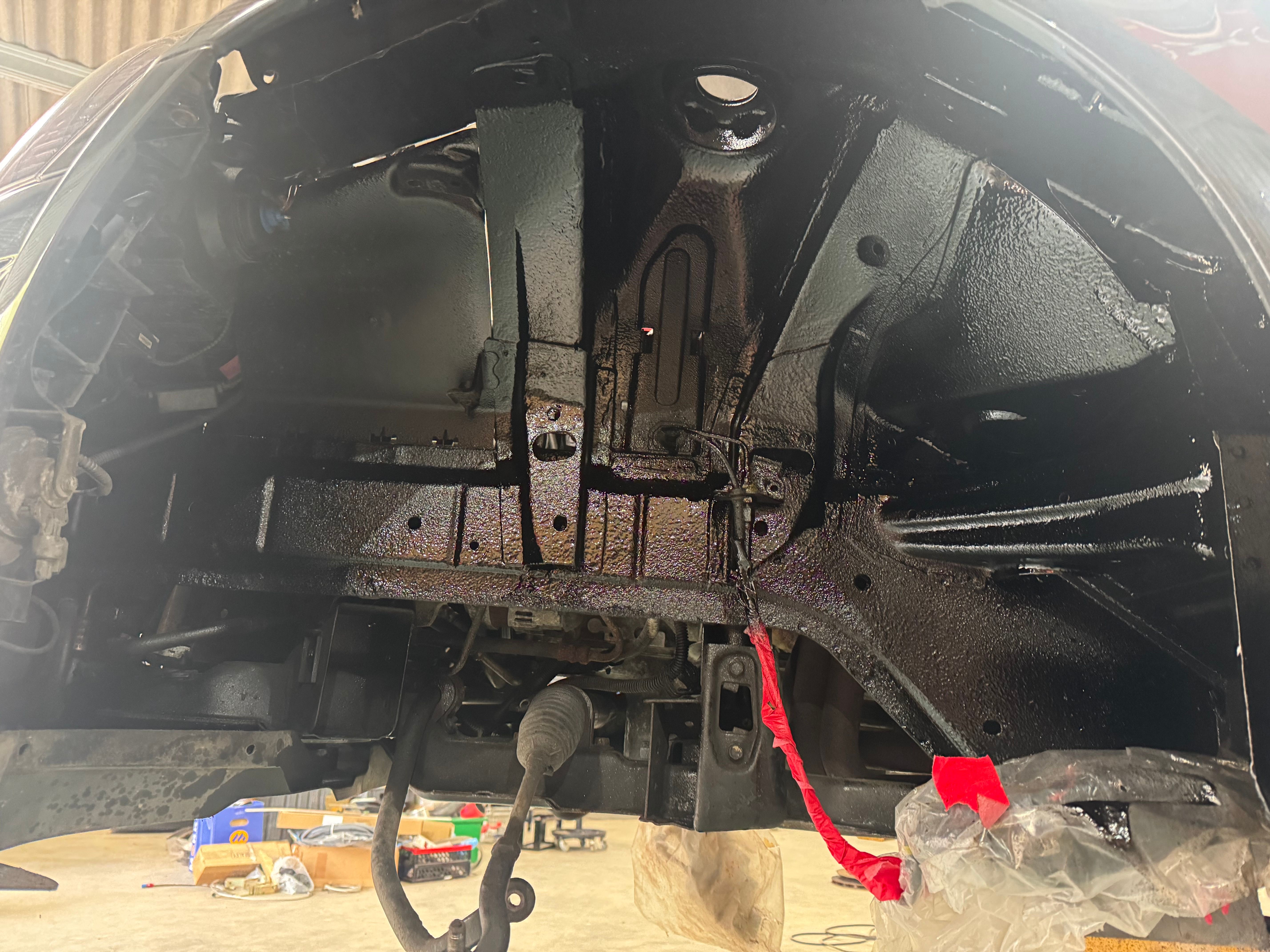 I bit the bullet last weekend and set to stripping the front end and rear shocks out. It had all been off before so came apart nicely. I took the opportunity to give the underside a bit of TLC so cleaned and undersealed it all, giving the cavities a good waxing while I was there.