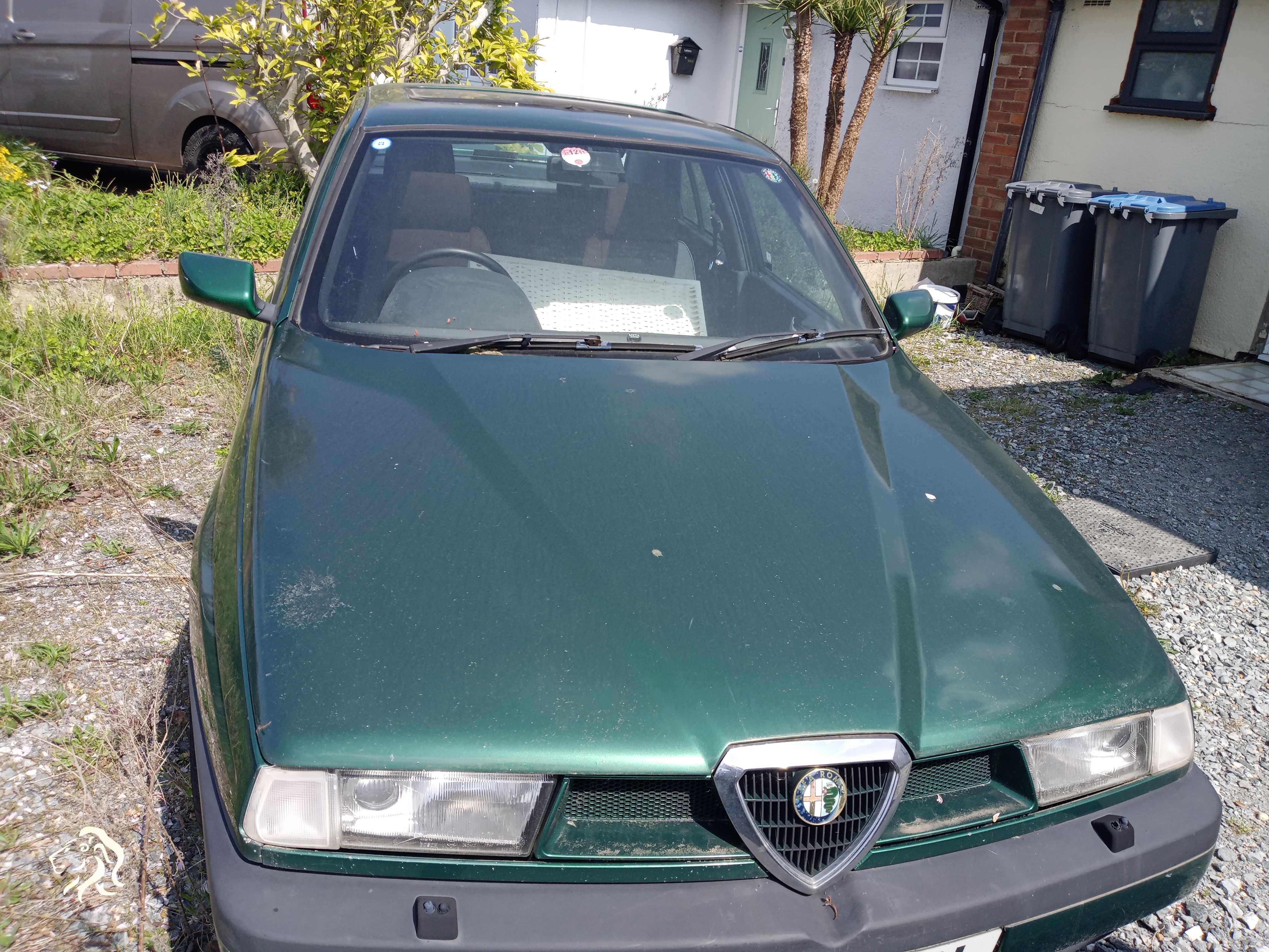 About 12 years ago I gave my daughter this widebody alfa 155. It developed a knock in the engine and she left it in her front yard for the last 6 years. I had bought it from A for Alfa in Aylesbury, who had a custom radiator mount, stainless exhaust system installed, lowered it slightly and chipped it. As a consequence, I have decided to have it brought back to my house and see if it worth restoring. Had a quick look underneath and while it has some rust seems to be not a write-off Will have a good look over in a couple of months, and, if it is not a total wreck, will set about sorting it out.