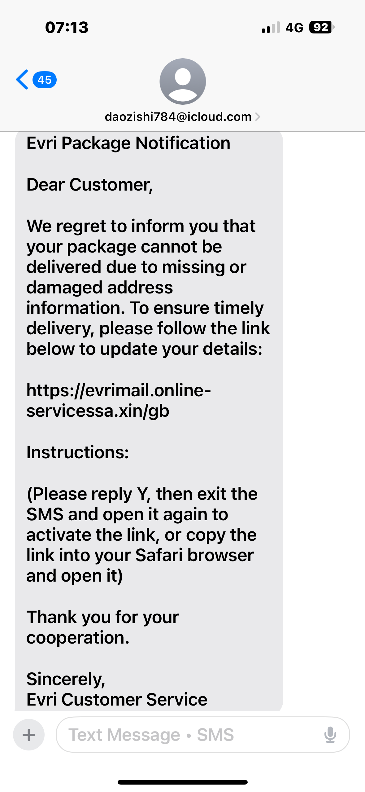 Get them a lot. They are obvious scam. I just delete them and don’t waste my time even trying to report it.Got a text message the other day, from 'Evri', when I was expecting a delivery! Text stated my parcel had an 'incomplete address and could I confirm it by return please? I'd completed the address part when the text stated there was a small charge for relabelling and redelivering my parcel. 0.023£ is how it was written! A British person wouldn't write it like that. Alarm bells rang so I deleted the text and got in touch with Amazon. Now I'm fairly certain Evri have in fact delivered to me, on behalf of Amazon before! But Amazon would not charge any extra for a failed delivery. Both points confirmed by the Amazon representative who answered my 'call me' request. She confirmed my Amazon delivery was ok, and on it's way to me via Amazon, and she would note the attempted phishing attempt. As I stated above, I stupidly deleted the text message when I got to the payment request so couldn't pass the details on!