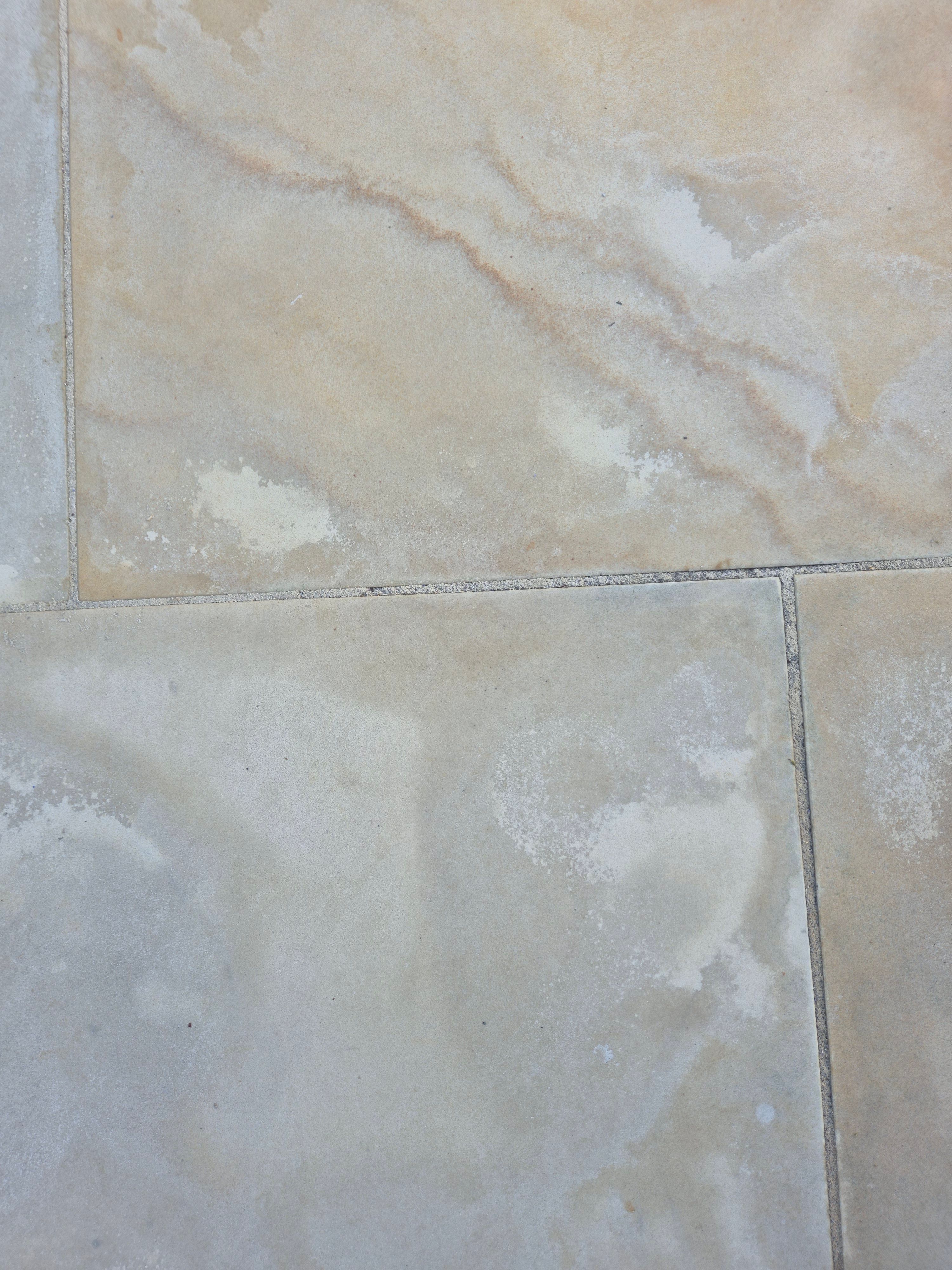 We have a sawn and smoothed Indian Sandstone patio. We have cleaned it (using chemicals) but these marks remain. The marks almost look like the slabs are retaining moisture, but can't see how that could be the case.