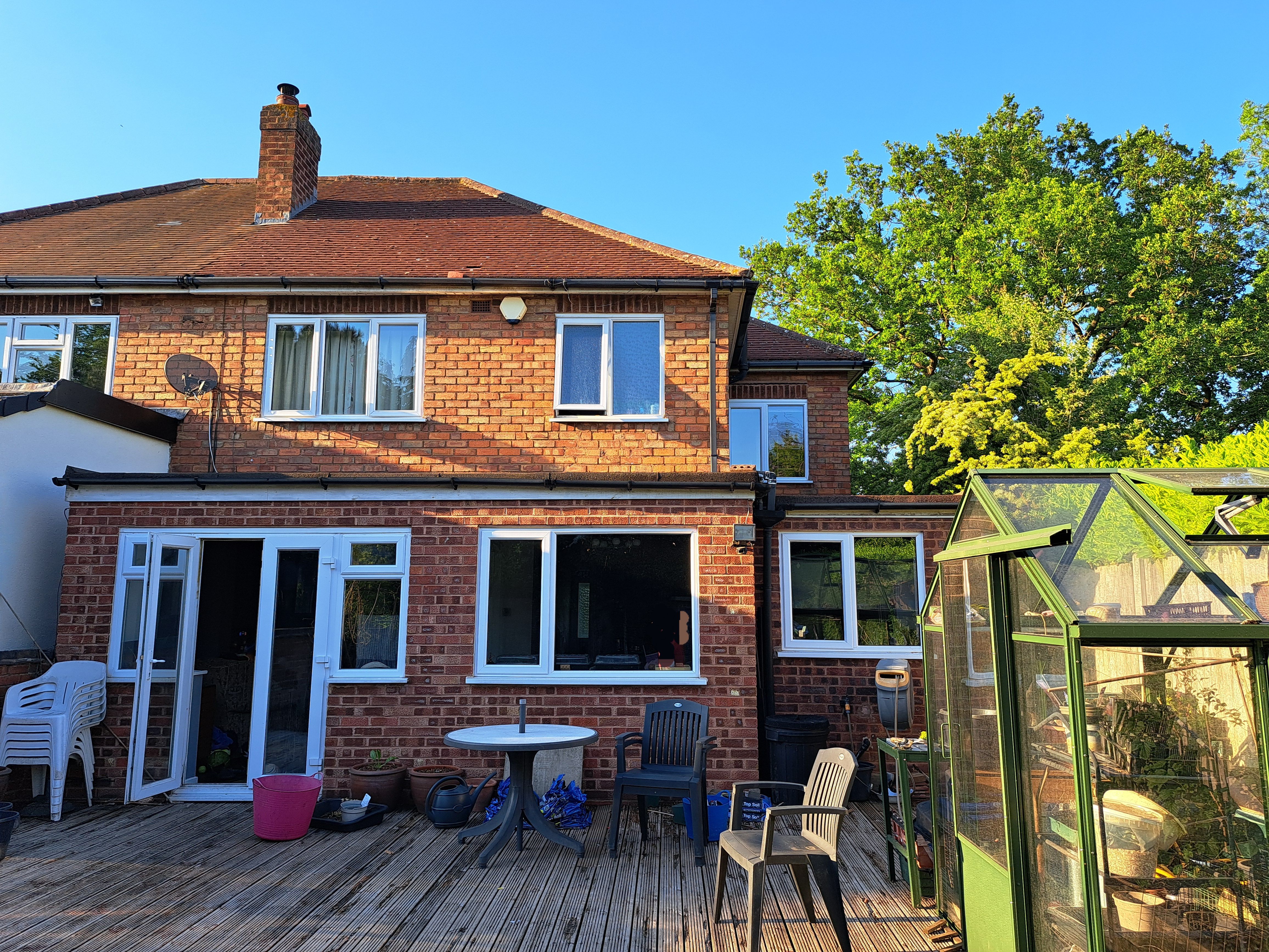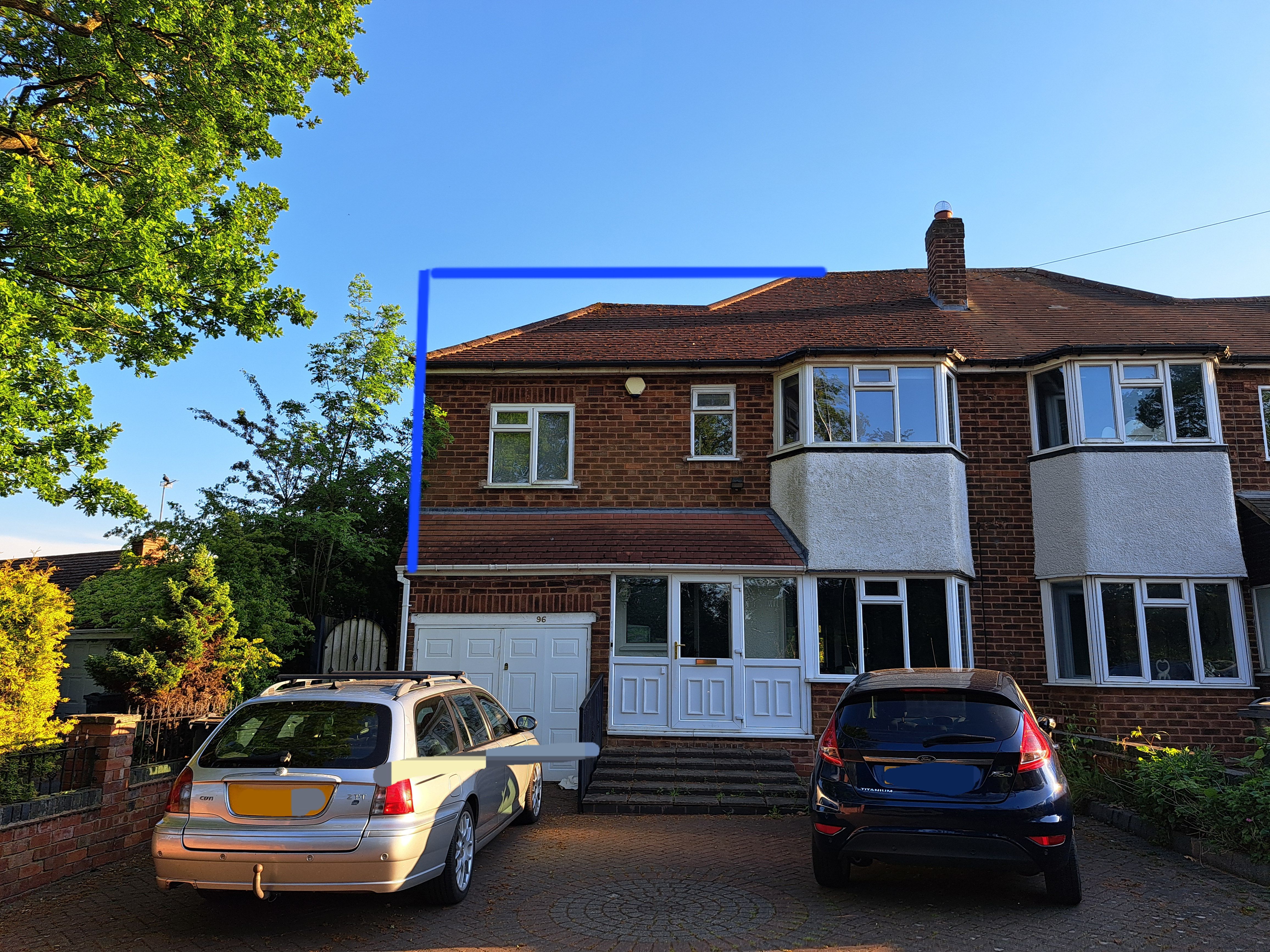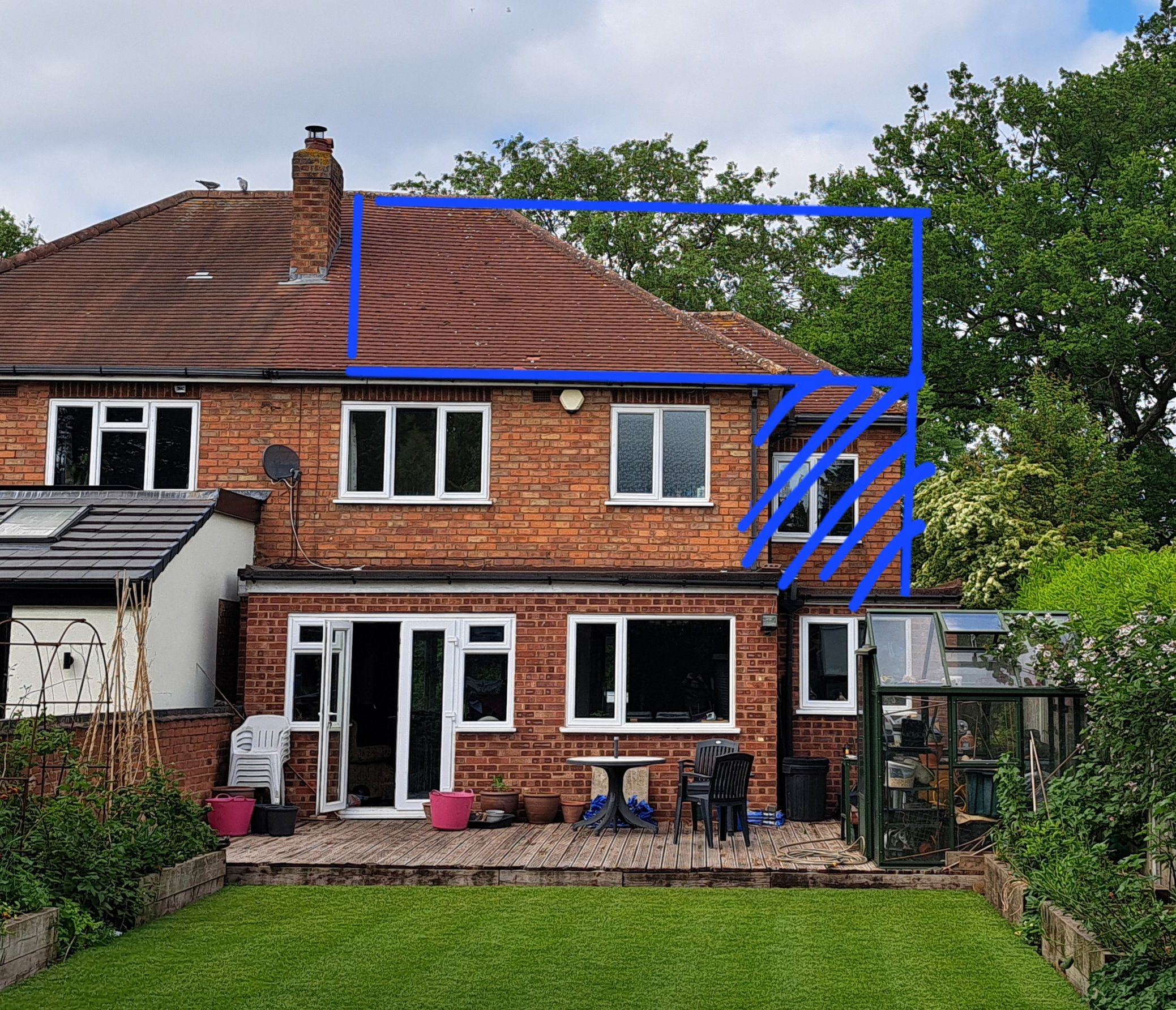 Yeah, that's fair enough. I've just put some lines on these photos, on my phone, with my finger! I don't currently have a working laptop so that's the best I can manage. Plan is to fill in the hatched area with extension, such that it lines up with the other first floor rear windows. Hip to gable conversion, so the roof is totally 'squared off', and will appear so if viewed from front and back. Then dormer to the rear of the roof, as close to full width as possible, so over the current forst floor windows and the new extended (hatched) bit.
