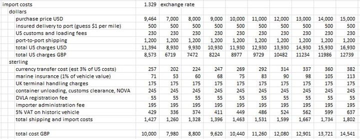 I pulled this together a few years ago so am sure some of the port and registration charges will have gone up but it looks broadly right. Anything I've forgotten?Purchase price. you need to factor in the exchange rate you will get for your money, then transport costs from where you buy to shipping location, shipping costs + insurance, then once landed import duty on all costs then VAT on the total