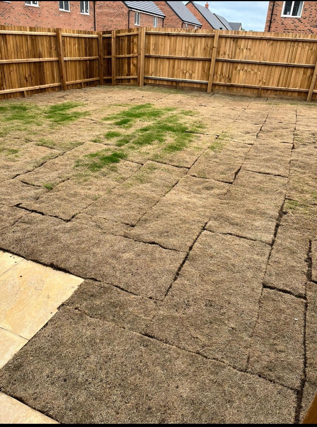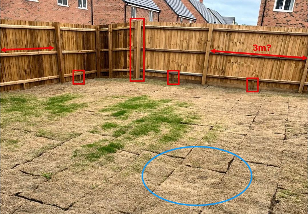 Very poorly laid, should lay turf like bricks with a half overlap. Obviously not been watered and that rear corner of the fence would do my head in