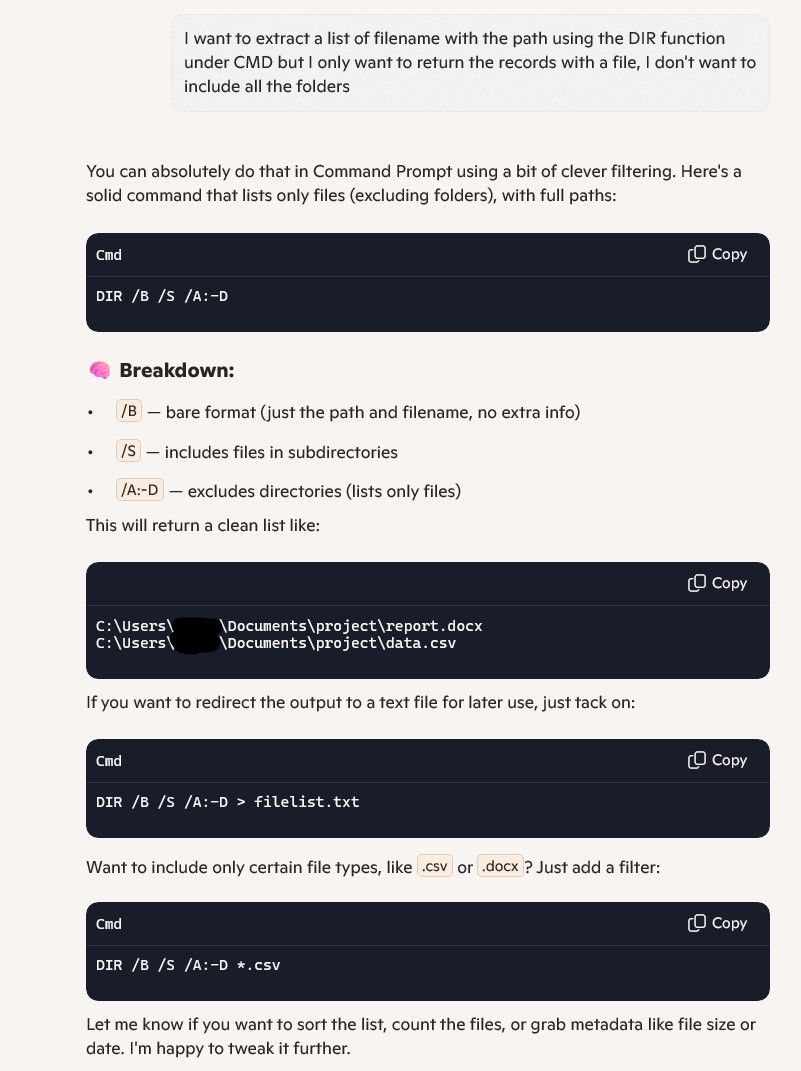 I want to extract a list of filename with the path using the DIR function under CMD but I only want to return the records with a file, I don't want to include all the folders i.e