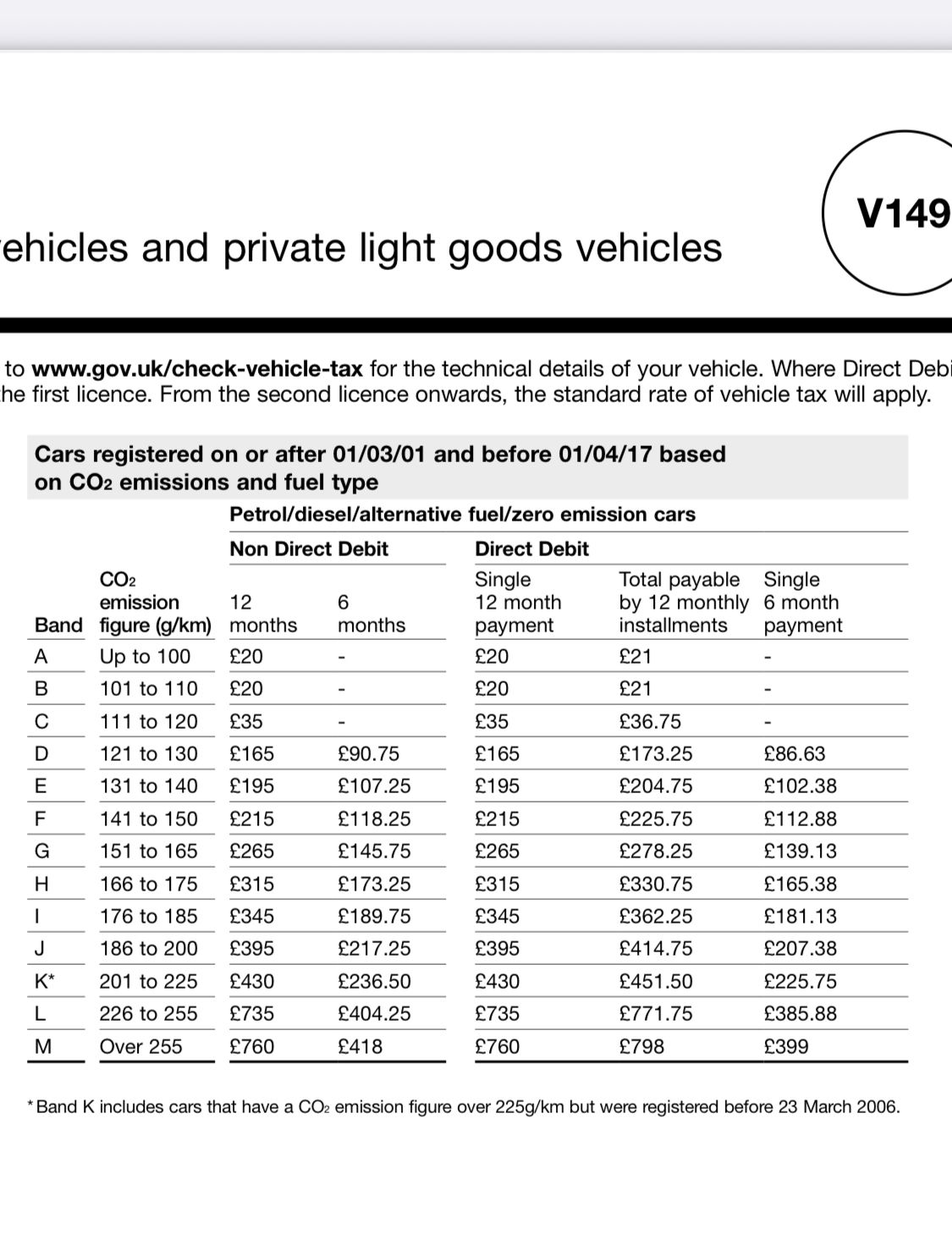 Band K includes cars that have a CO2 figure of more than 225g/km but were registered before 23 March 2006. Annual rate after the first year assumes single payment for the whole year. You can choose to set up a direct debit to pay monthly, or pay a single payment every six months. If you choose either of these options, you will pay more compared with a single payment for 12 months.