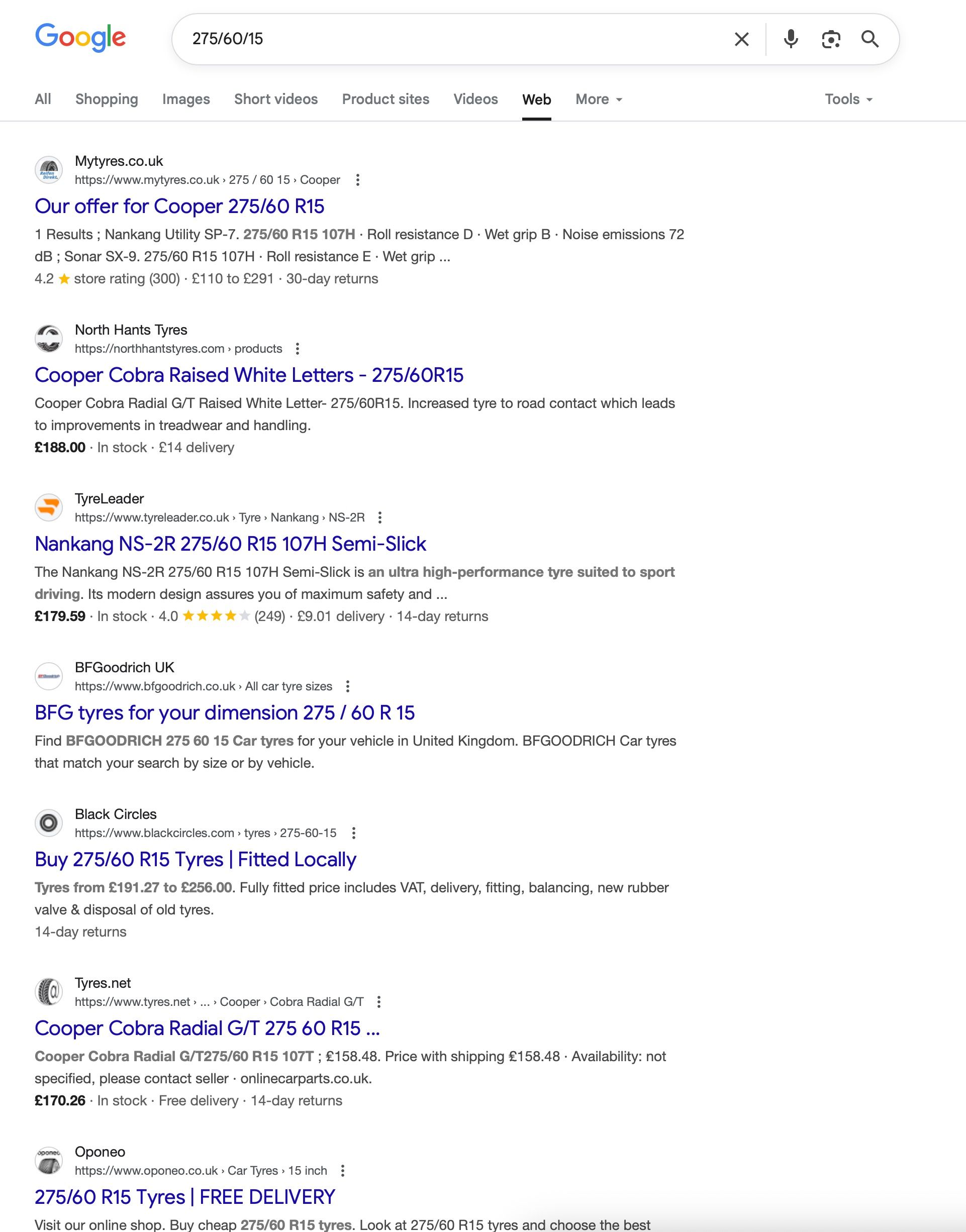 What was the exact search term that brought that up...and what browser/extensions are you running? If I search for "Cooper Tire Cobra Radial GT" on google, the first 203 pages are all either CooperTire or known tyre retailers.