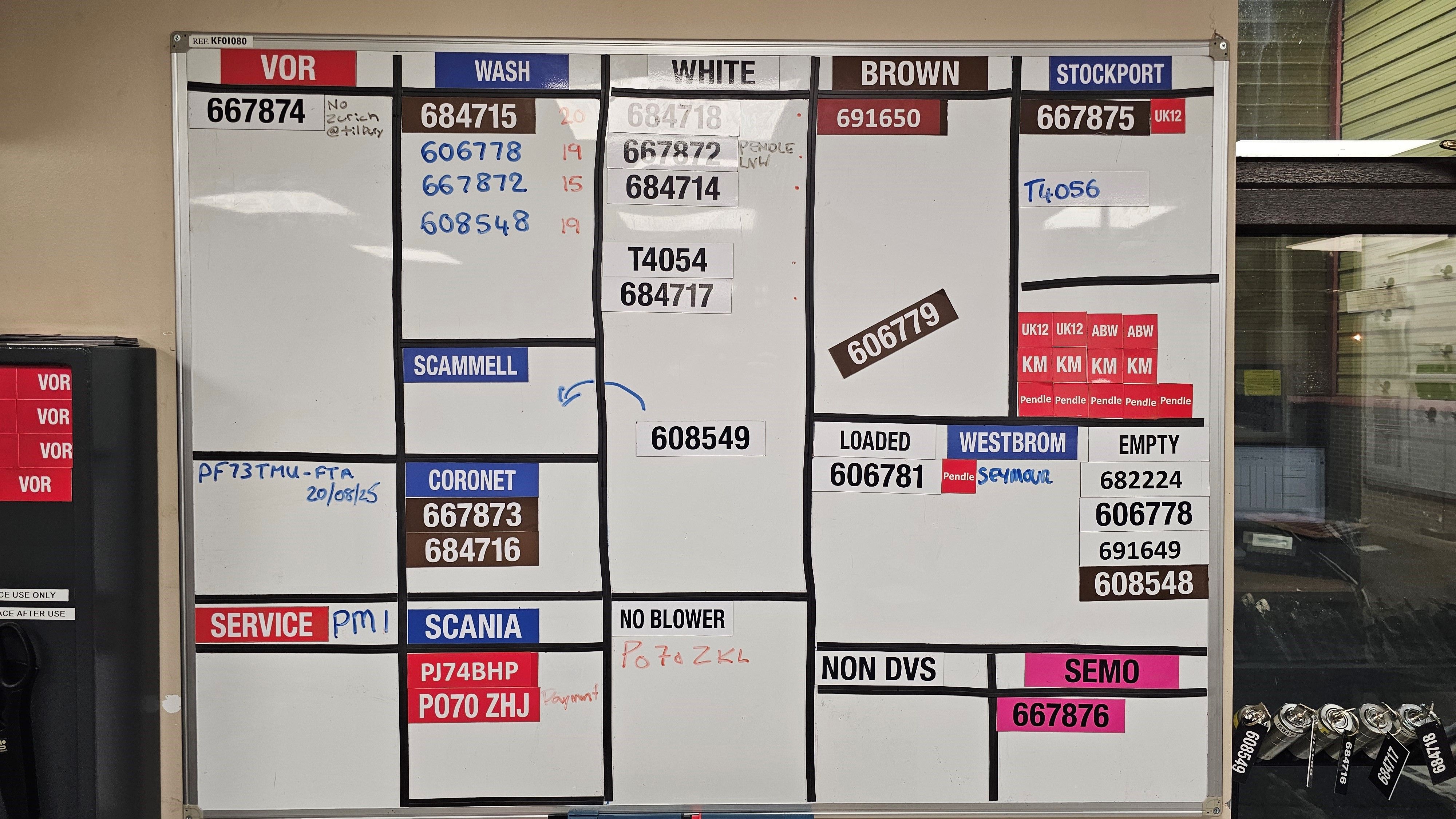 It’s straightforward and works fine, but there are drawbacks, such as the truck/trailer combinations often changing and being renewed, so we are constantly buying new magnets etc. Due to how much we use this board and with it being a 24/7 operation, we also go through whiteboard markers like a fat kid on cake, which is why we’ve replaced the system with an “IIYAMA” branded Android-based smart TV.