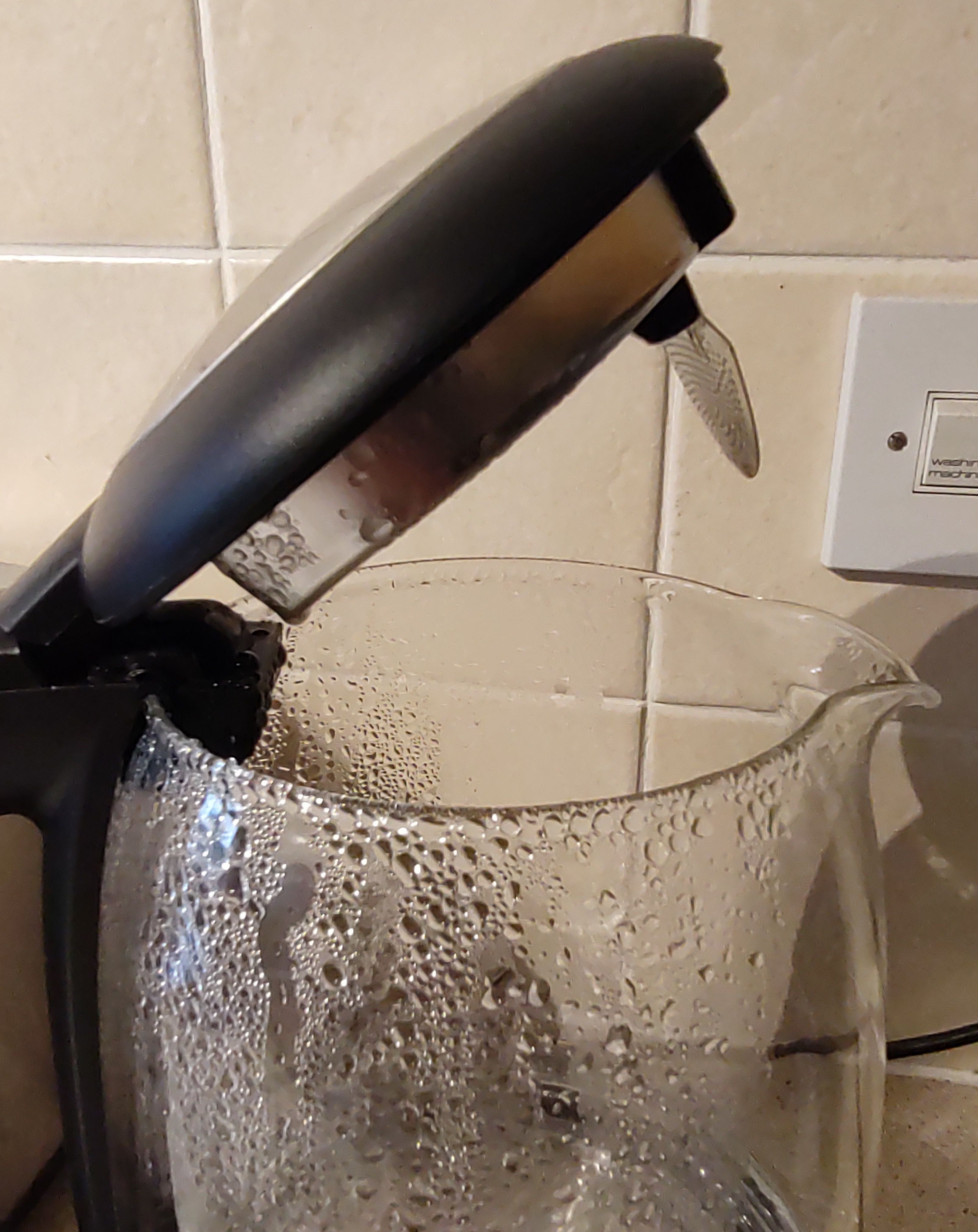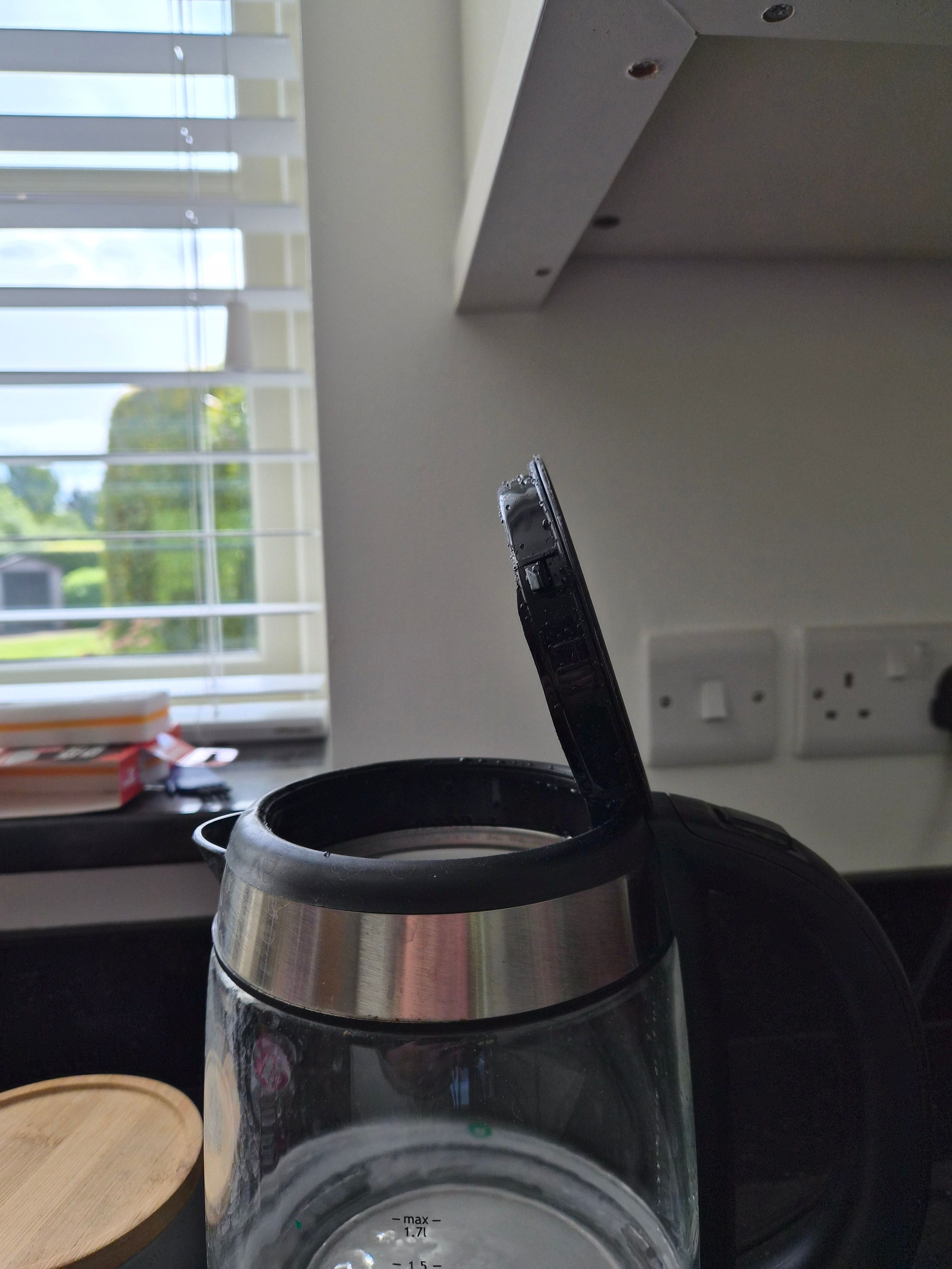 We need a new kettle. O/H would like one where the push-button lid opens 90 degrees to the top, i.e. wide open and made of glass, preferably with cup measures marked both sides.