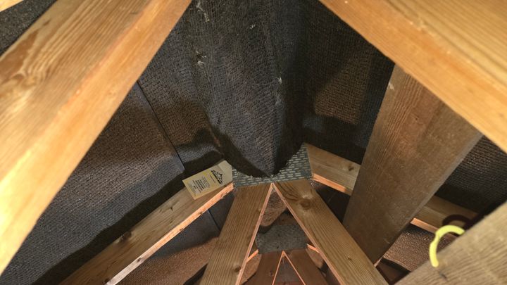 I was in the loft looking at the ducting for the extractor fan and noticed it had come away. However, on closer examination there were several bulges in the felting along the apex with many holes of varying sizes. On feeling these, it was clear that there was solid material underneath.
