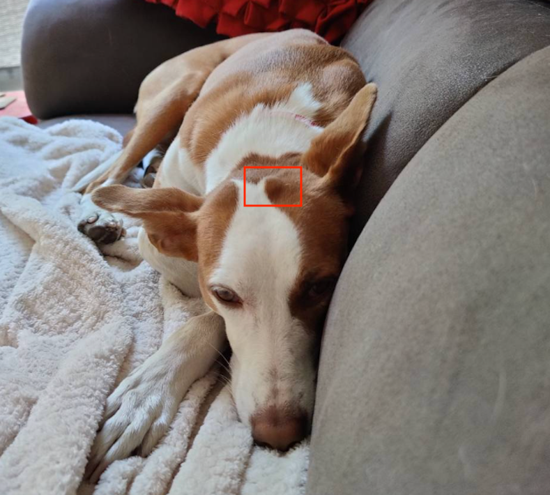 But she has an odd bump on the top of her head which we noticed shortly after we took her, and it's started to bother me. Highlighted in red below because it's quite hard to see under her fur: