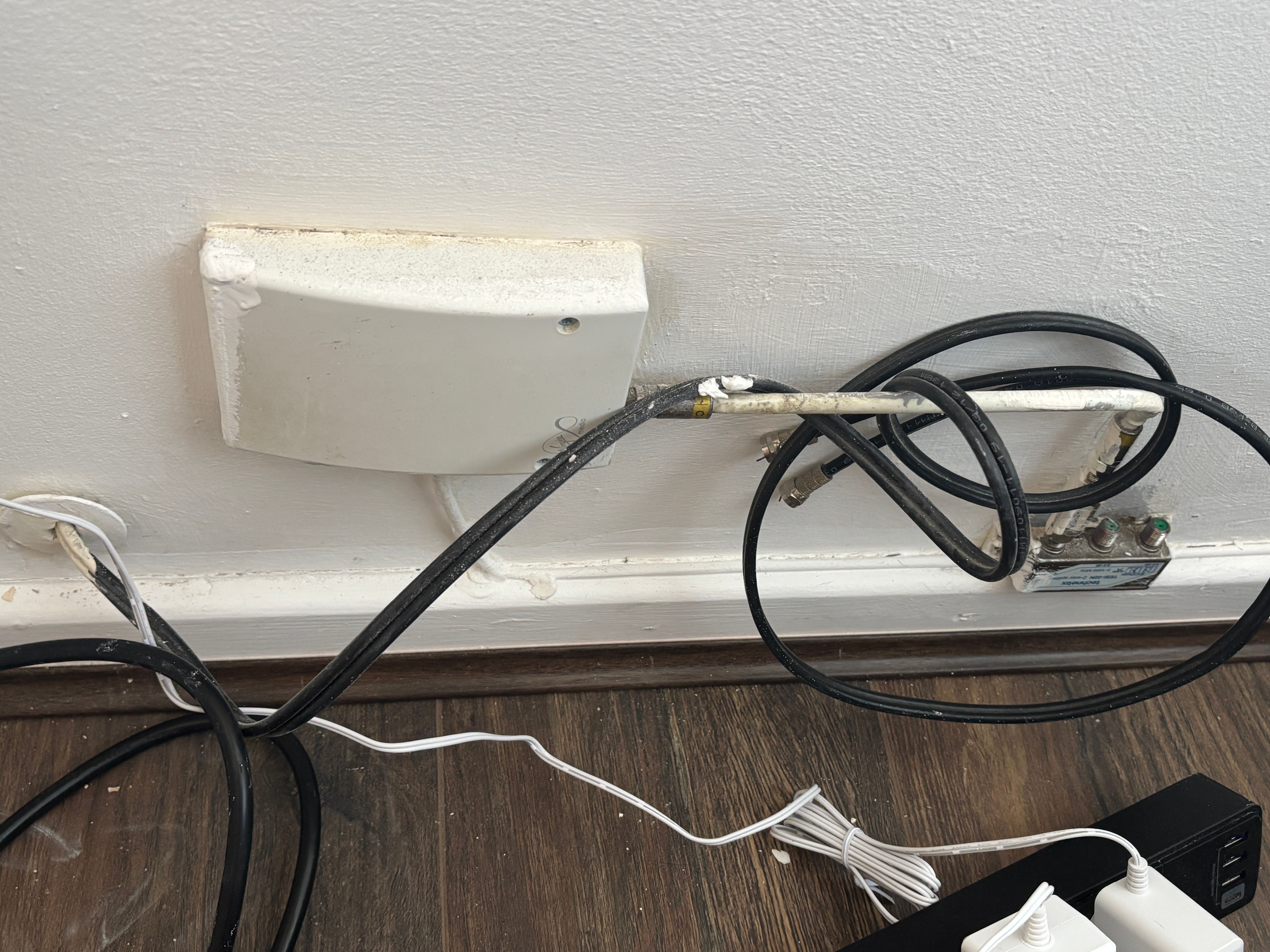The white cable coming from the small wall box on the right previously ran into the back of the old Virgin router.