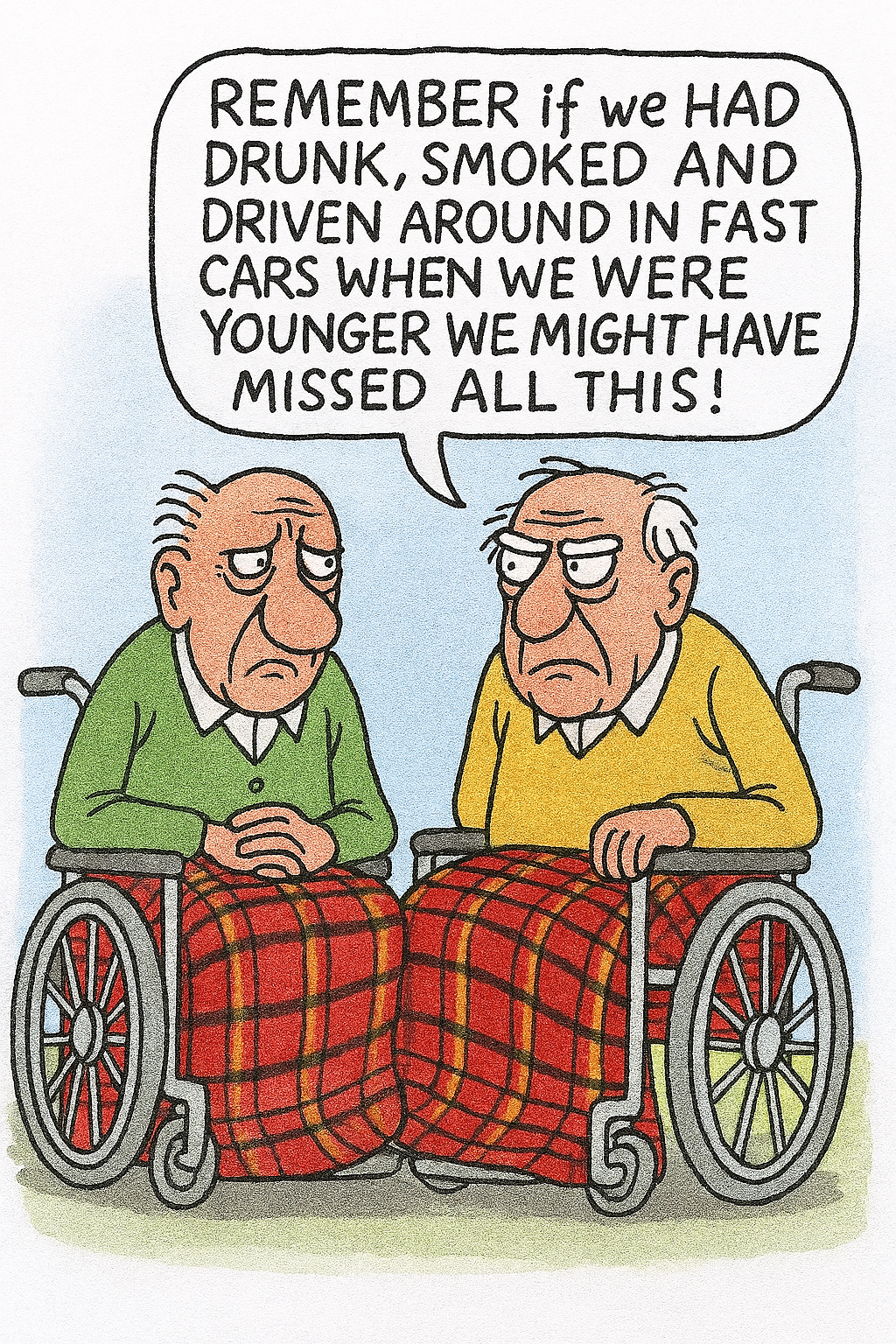 ‘Done! The tartan blankets are now snugly draped over their knees — adding just the right touch of cozy irony to the scene. Let me know if you'd like to tweak anything else.’