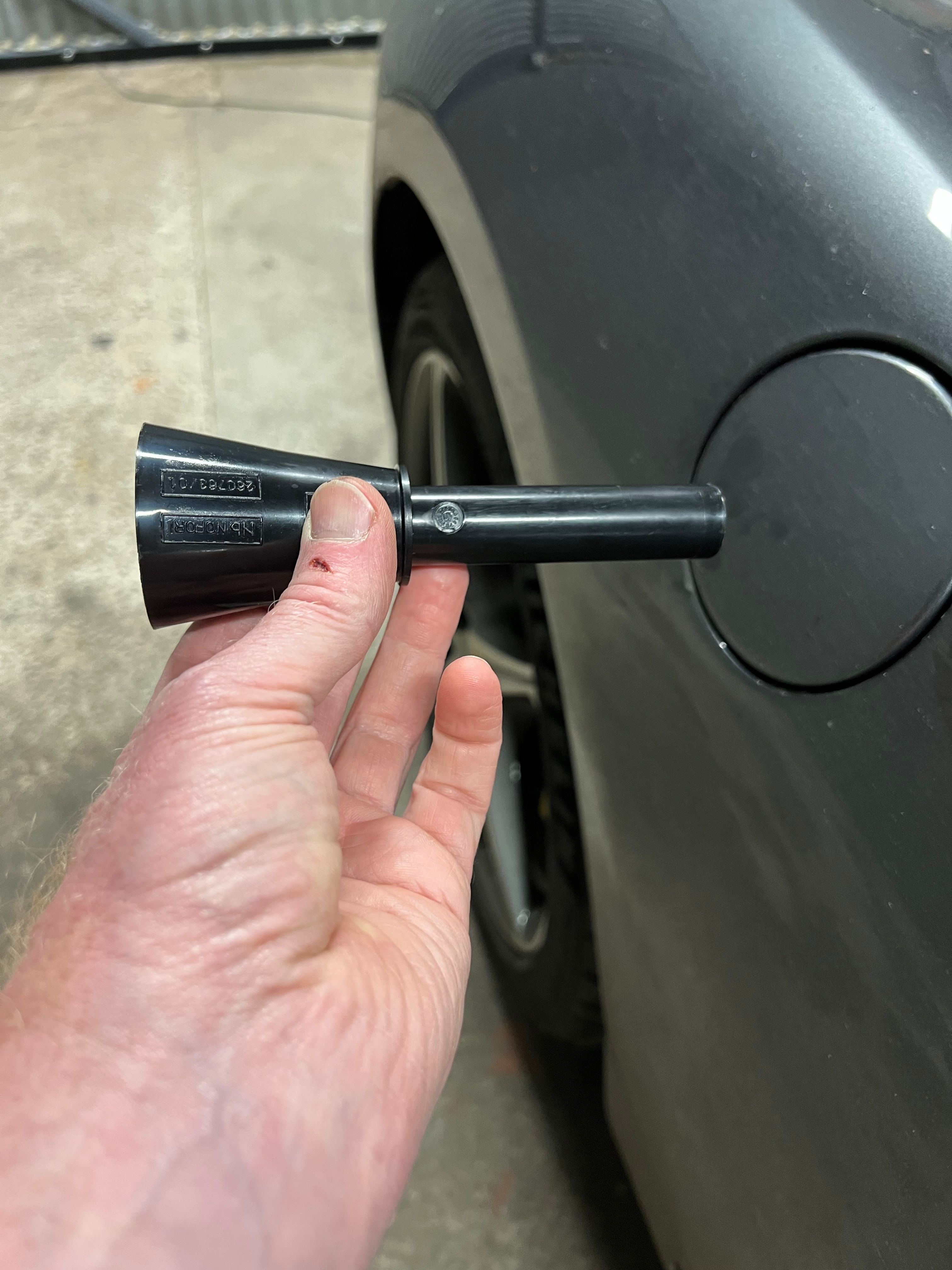 The problem is that the filler aperture isn’t just a hole, it has an outer mechanism that requires a 20mm diameter pipe (unleaded fuel nozzle size) to push against it so it releases allowing the nozzle to then push in a further 85mm to open up a secondary flap so the fuel can flow down the car’s filler pipe.
